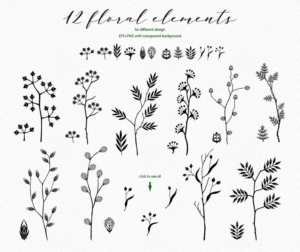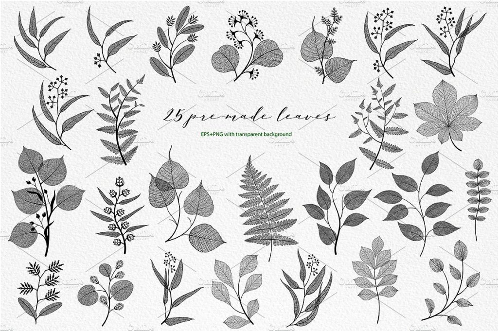 分享一组静谧的树叶树枝纹理素材打包下载[eps,png],高清矢量素材,适用于卡片,标志,请柬,剪贴簿,婚礼请柬,纺织品等。