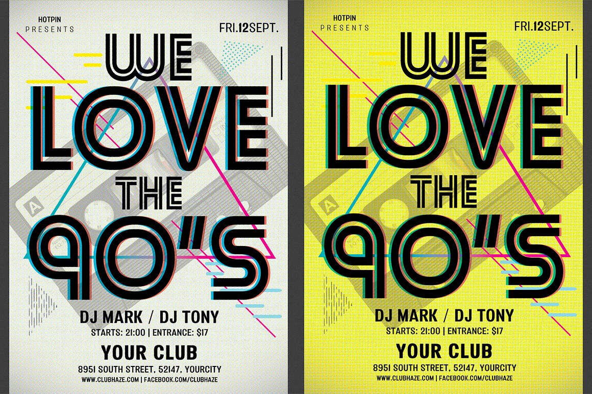 90年代复古派对传单模板是psd传单,拥有复古外观,将给您即将到来的活动或夜总会派对提供完美的推广! 所有元素都在单独的层中,并且文本是可编辑的!