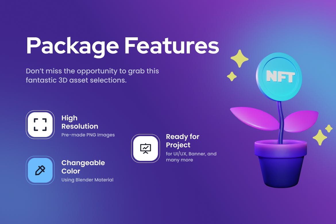 **3D NFT图标插图包**通常用于任何需要知道所有内容位置的项目。最好的部分是什么?这个3D产品资产可以随时使用,可以在blender软件中定制颜色,并且有一个高分辨率的渲染文件,可以作为一个突出的插图支持您的项目,例如登录页项目、移动应用程序项目、Flyer项目或其他品牌项目。您可以从这个新的3D资产中获得一些好处。立即创作你的精彩作品!