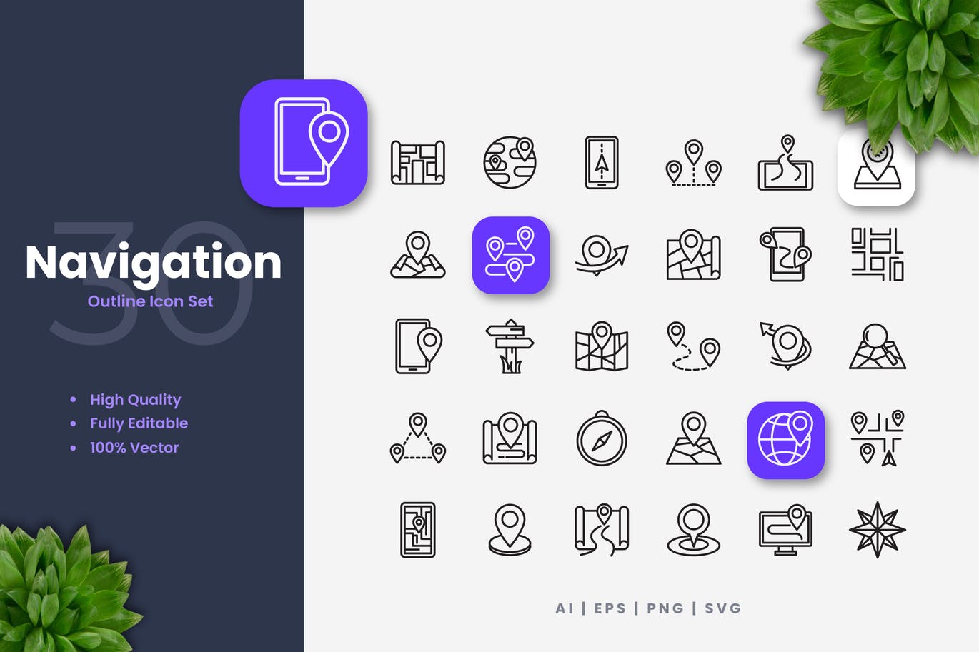**一套30个导航轮廓图标**|设计简洁,适用于网站、移动应用程序、书籍、社交媒体、信息图形、,