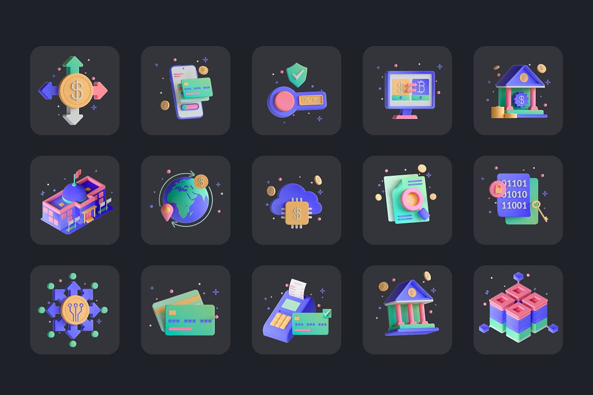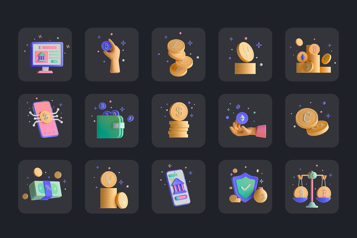这些3D数字货币图标不仅外观流畅、现代,而且易于定制。您可以随意更改它们的形状、大小和颜色,直到它们正好适合您的项目或品牌。