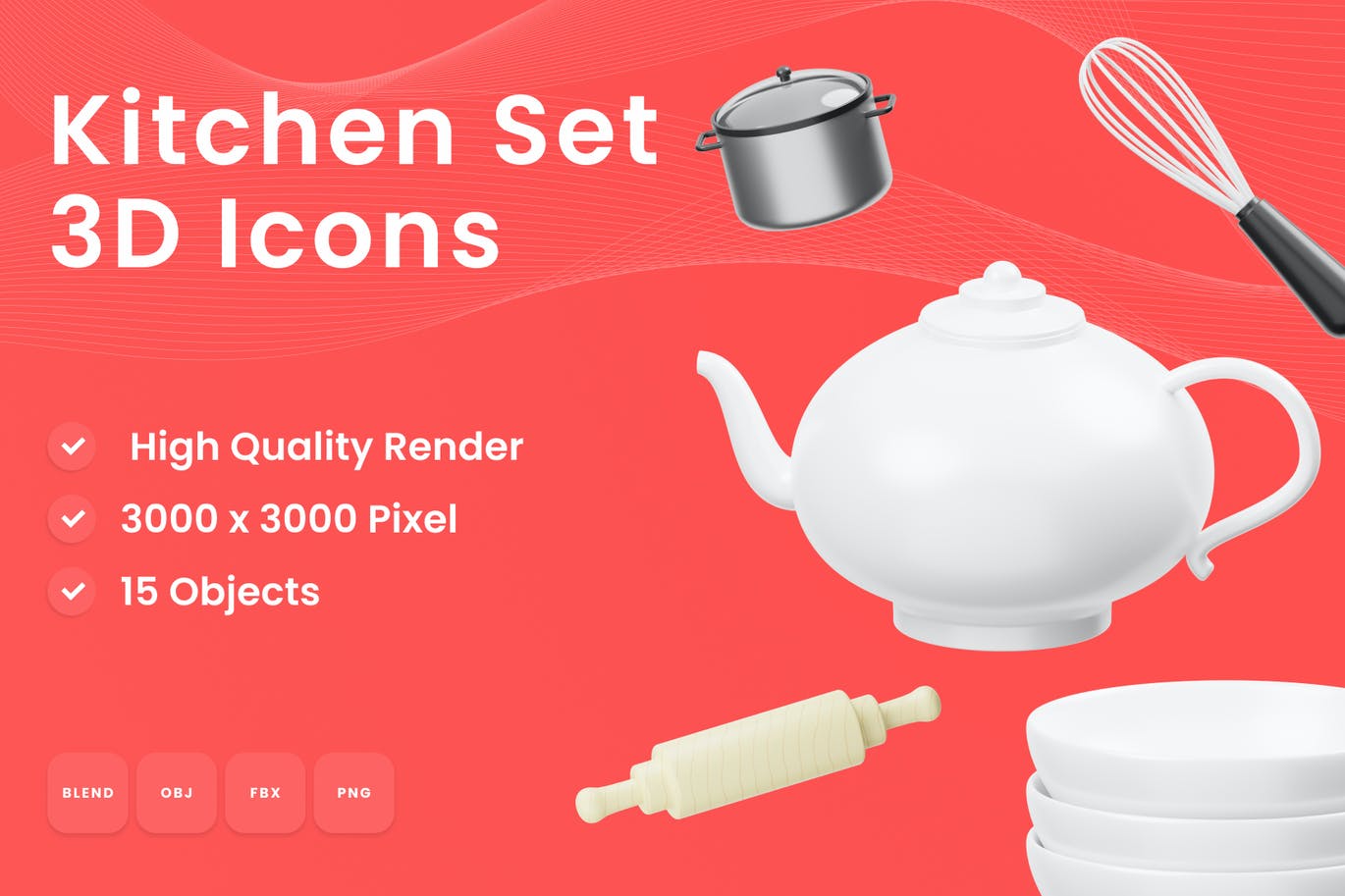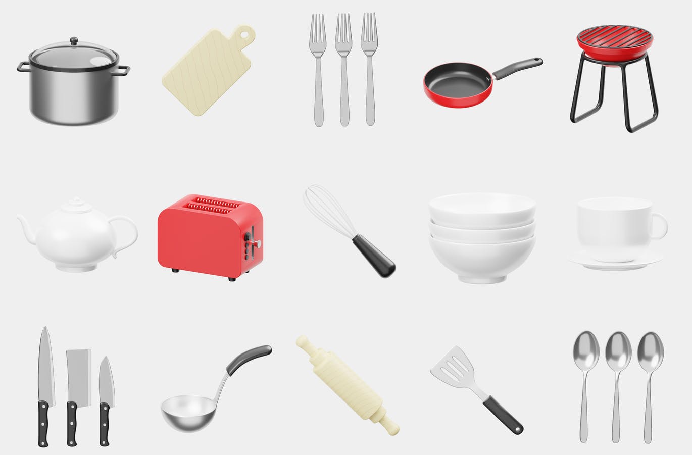15个现成的3D厨房设置图标文件对象,用于网站、移动应用程序等。使用3D资源增强您的设计。