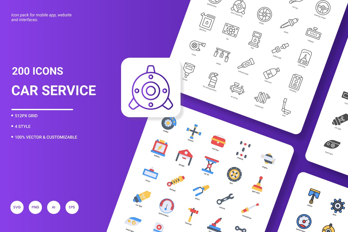 **汽车服务图标包**由200个时尚图标组成,展示最流行的服务和理念。它非常适合网站设计、移动应用程序、演示、分析报告、信息图形或网站模板。
