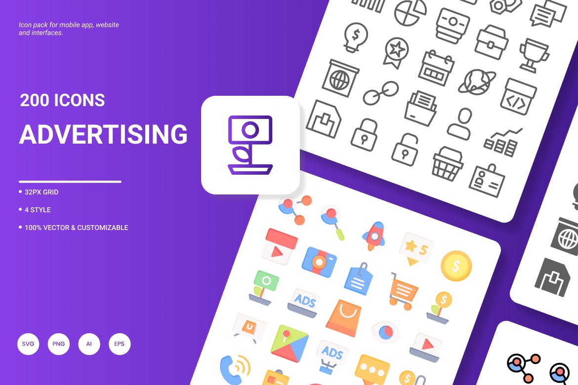 **广告图标包**由200个时尚图标组成,展示最流行的服务和理念。它非常适合网站设计、移动应用程序、演示、分析报告、信息图形或网站模板。