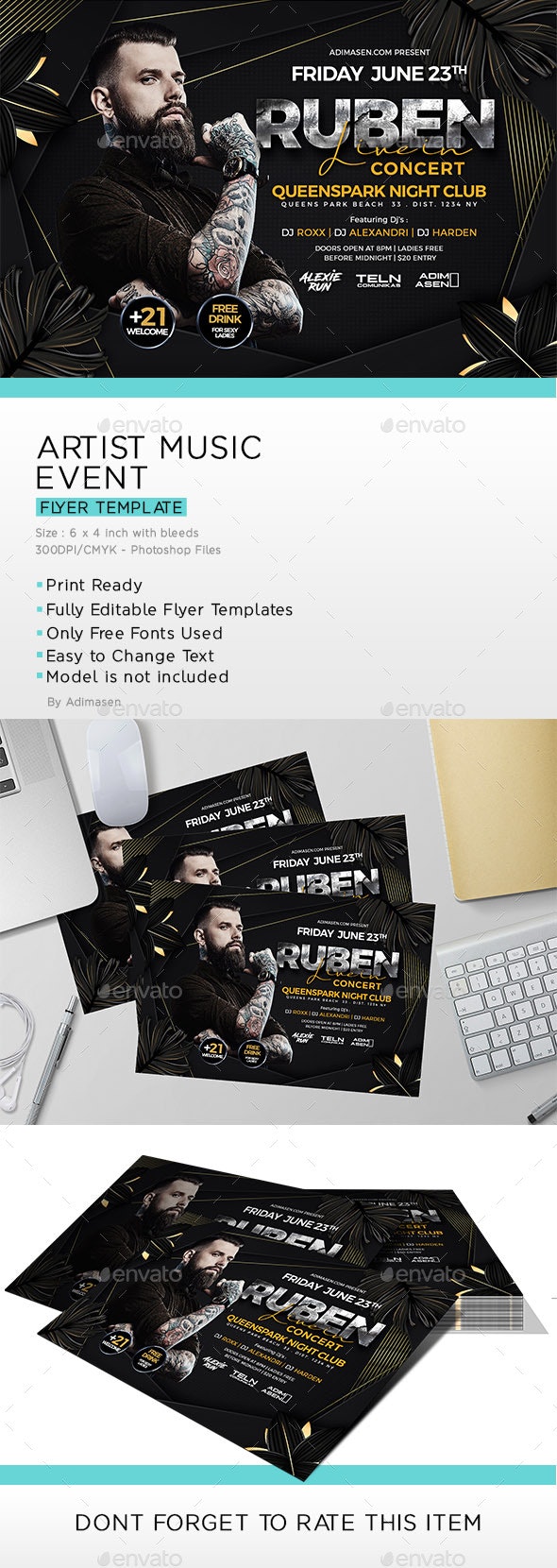 艺术家音乐活动传单设计模板,此模板可适用于生日派对、音乐会、夜总会、俱乐部等。