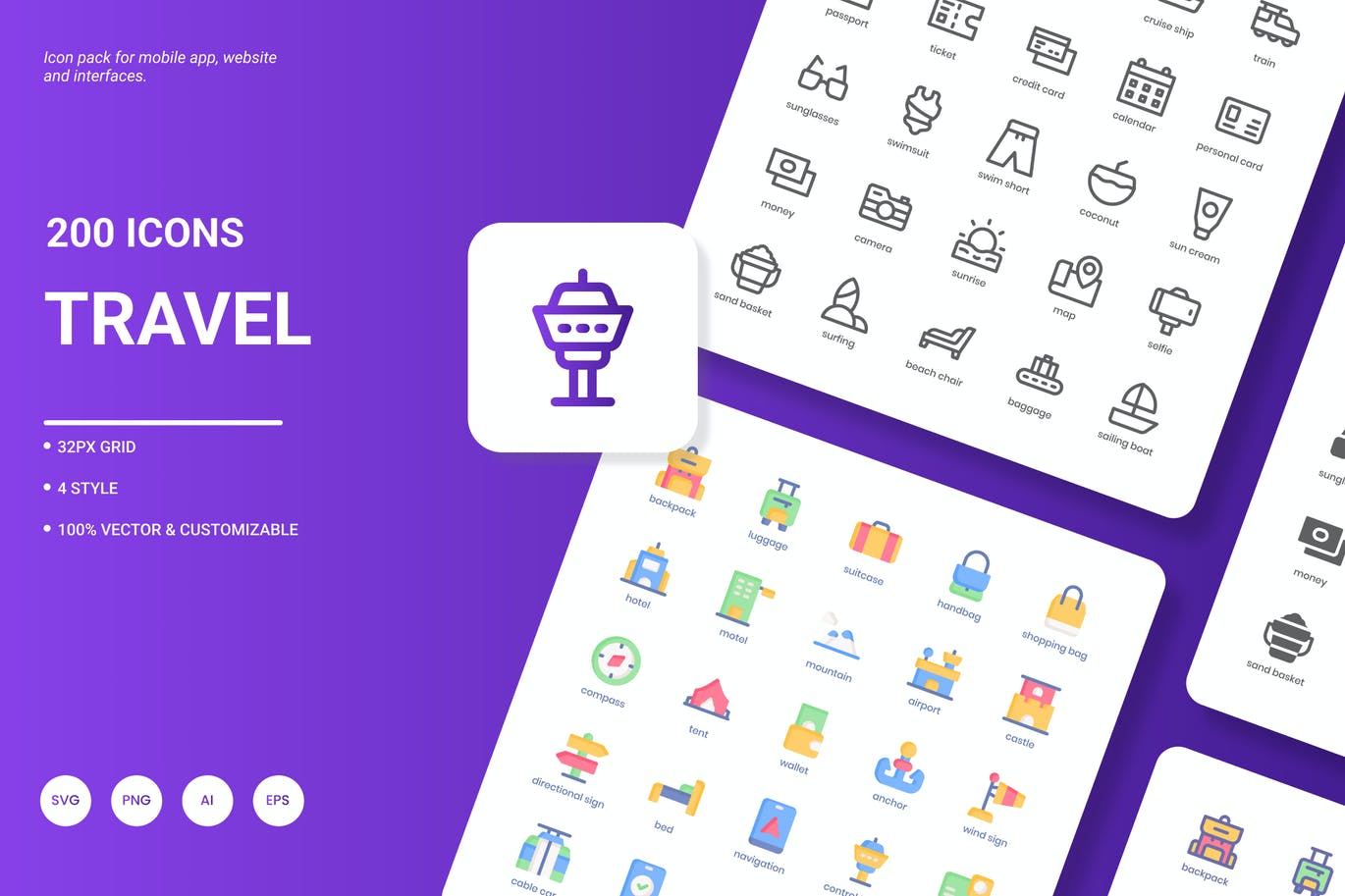**旅游图标包**由200个时尚图标组成,展示最流行的服务和理念。它非常适合网站设计、移动应用程序、演示、分析报告、信息图形或网站模板。