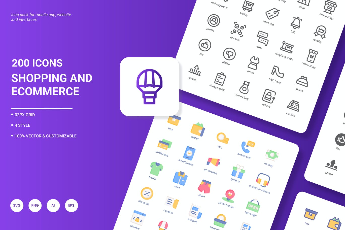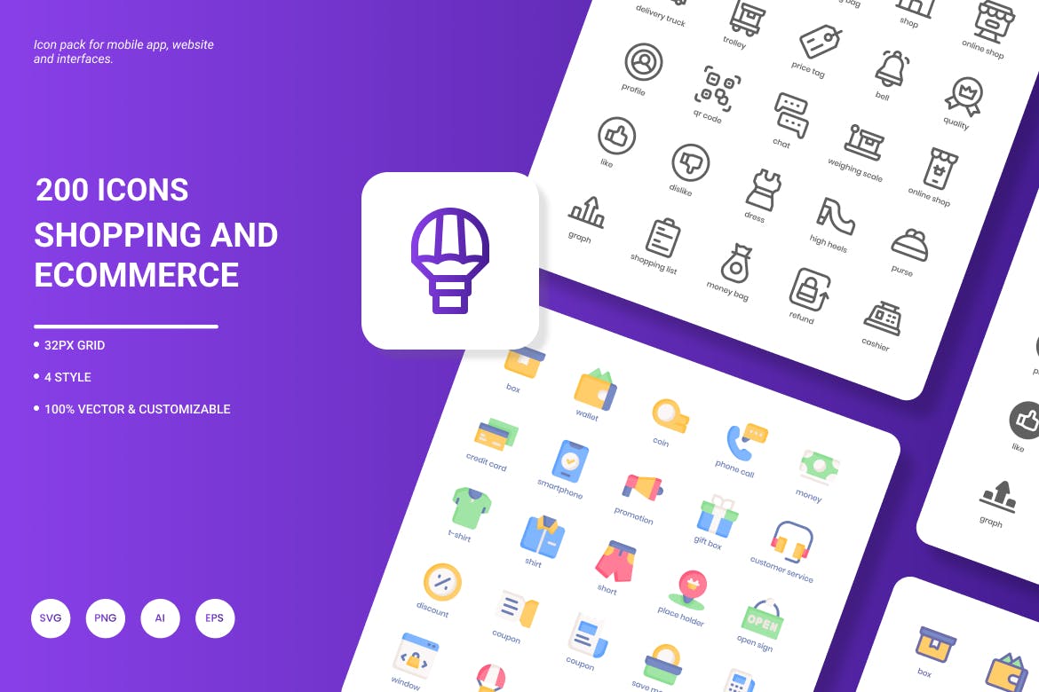 **购物和电子商务图标包**由200个时尚图标组成,展示最流行的服务和理念。它非常适合网站设计、移动应用程序、演示、分析报告、信息图形或网站模板。