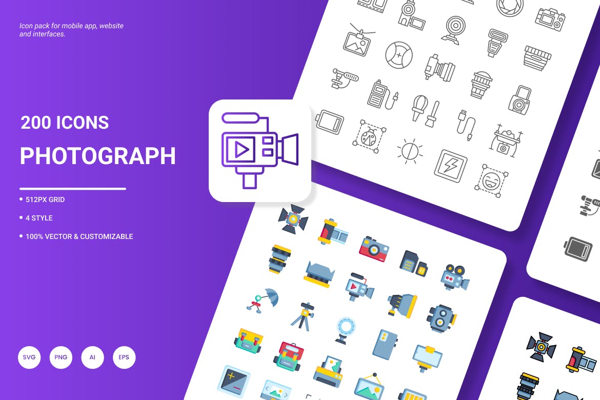 **摄影图标包**由200个时尚图标组成,展示最流行的服务和理念。它非常适合网站设计、移动应用程序、演示、分析报告、信息图形或网站模板。