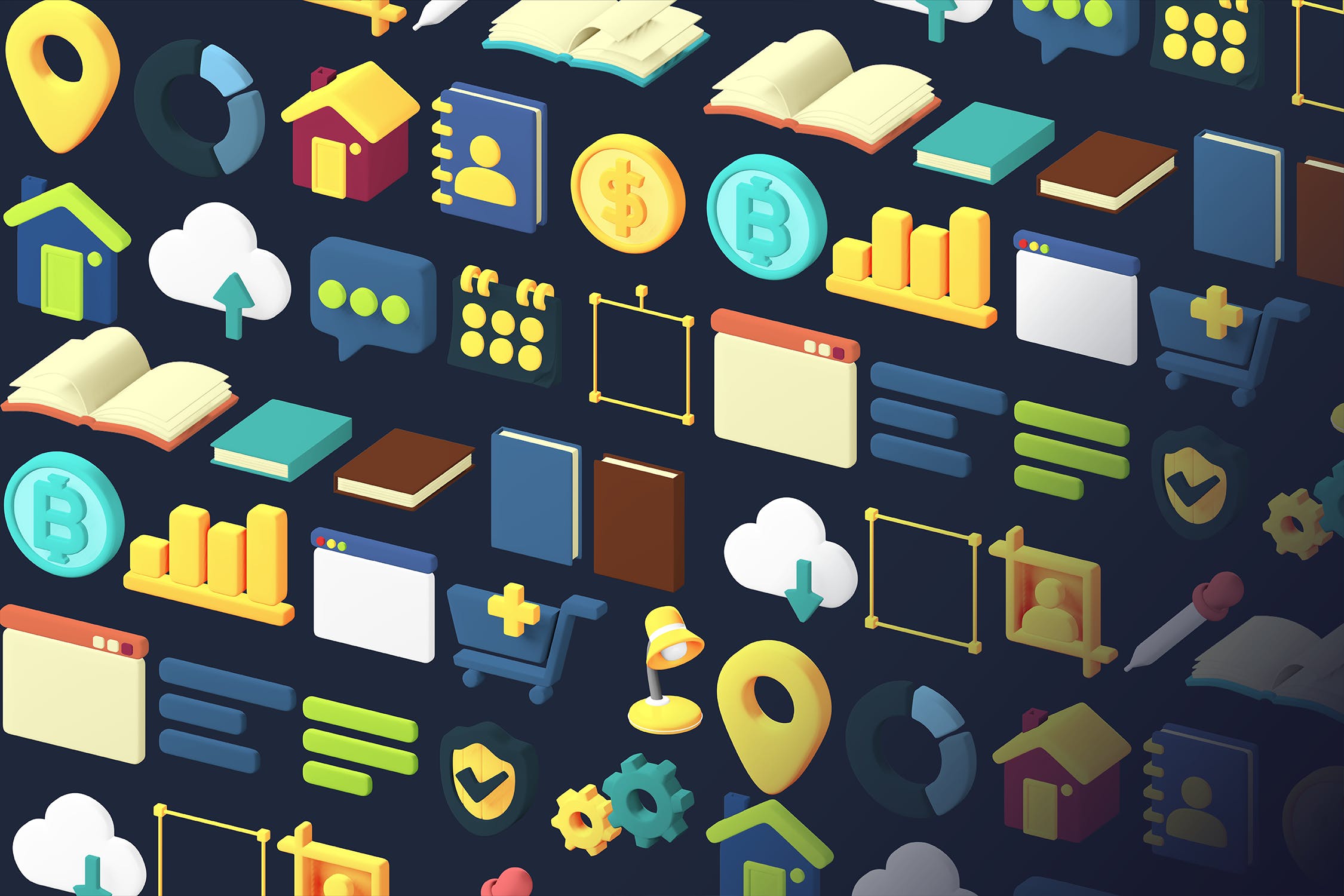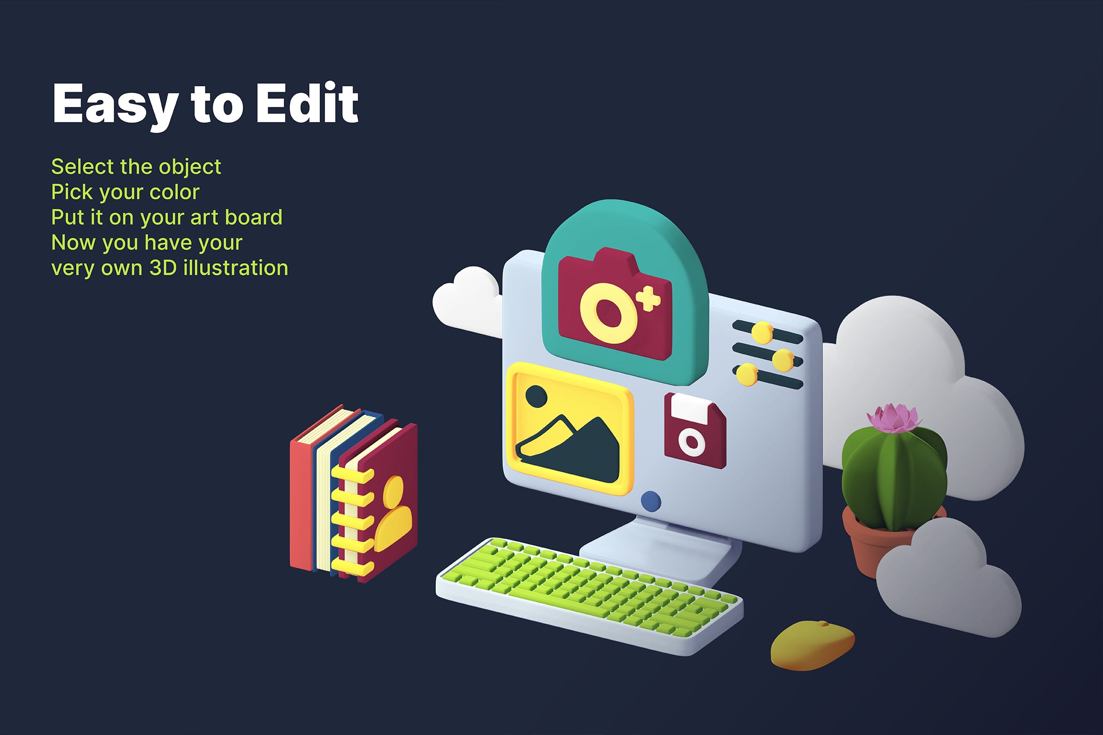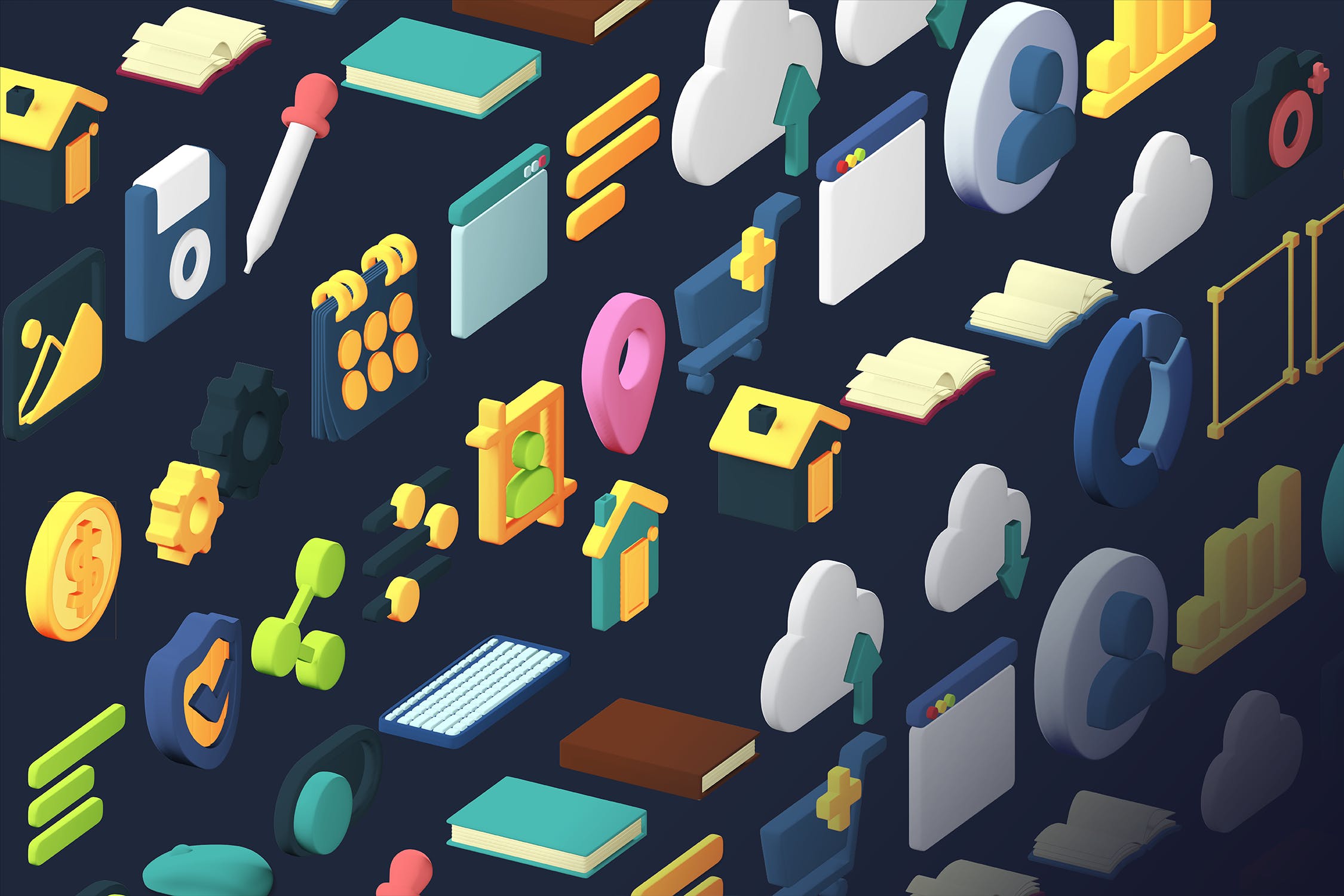 设置自己的3D等轴测PC桌面。可以找到50多个对象,每个对象以2个角度渲染。