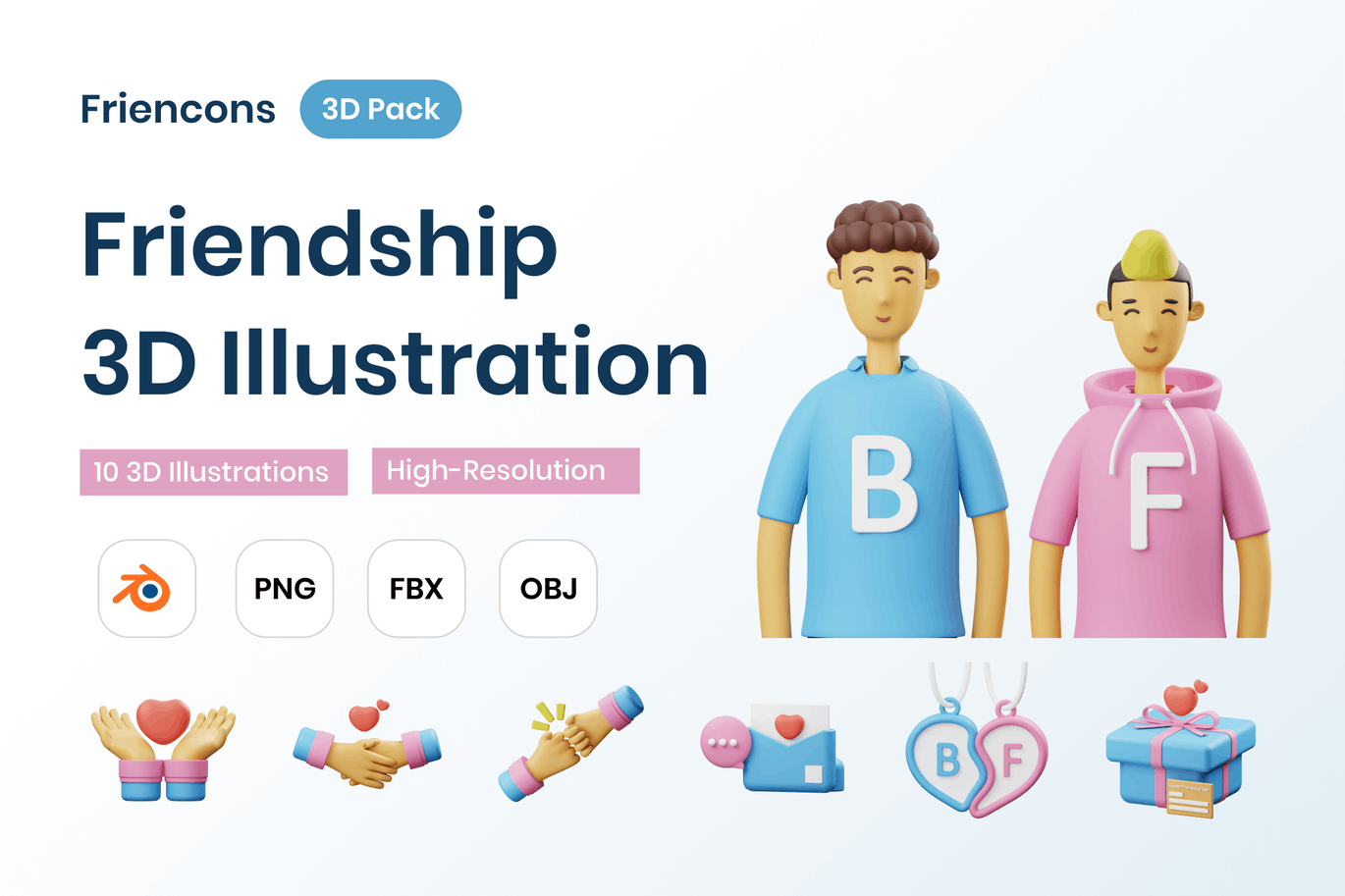 10个现成的3D友谊插图文件对象,用于网站、移动应用程序等。使用3D资源增强您的设计。