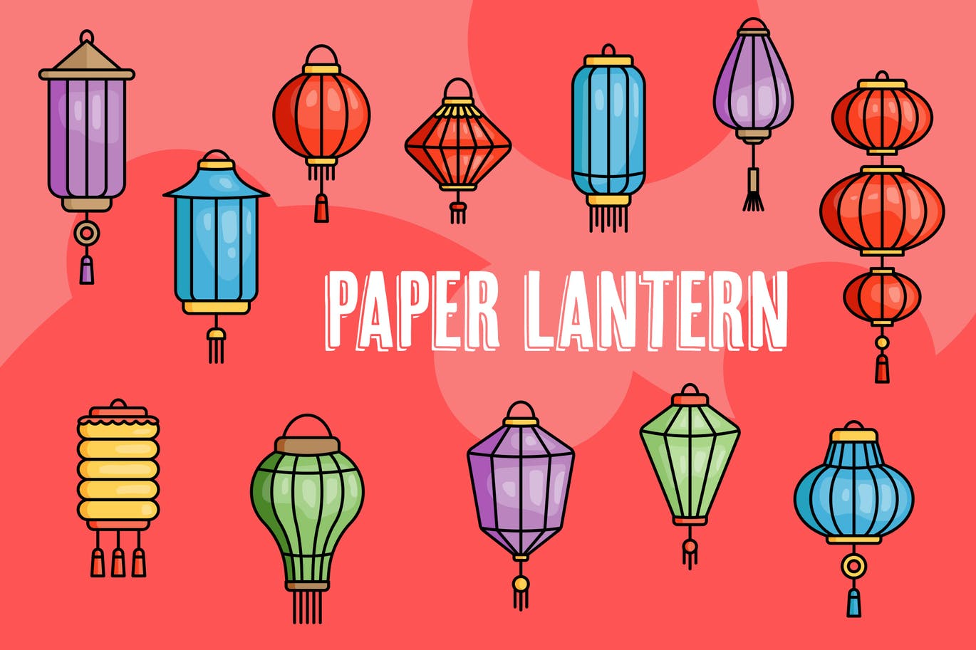 这是矢量中设置的中国纸灯笼图标。这些纸灯笼图标采用现代风格,每个项目都有不同的风格。有12个不同的项目。