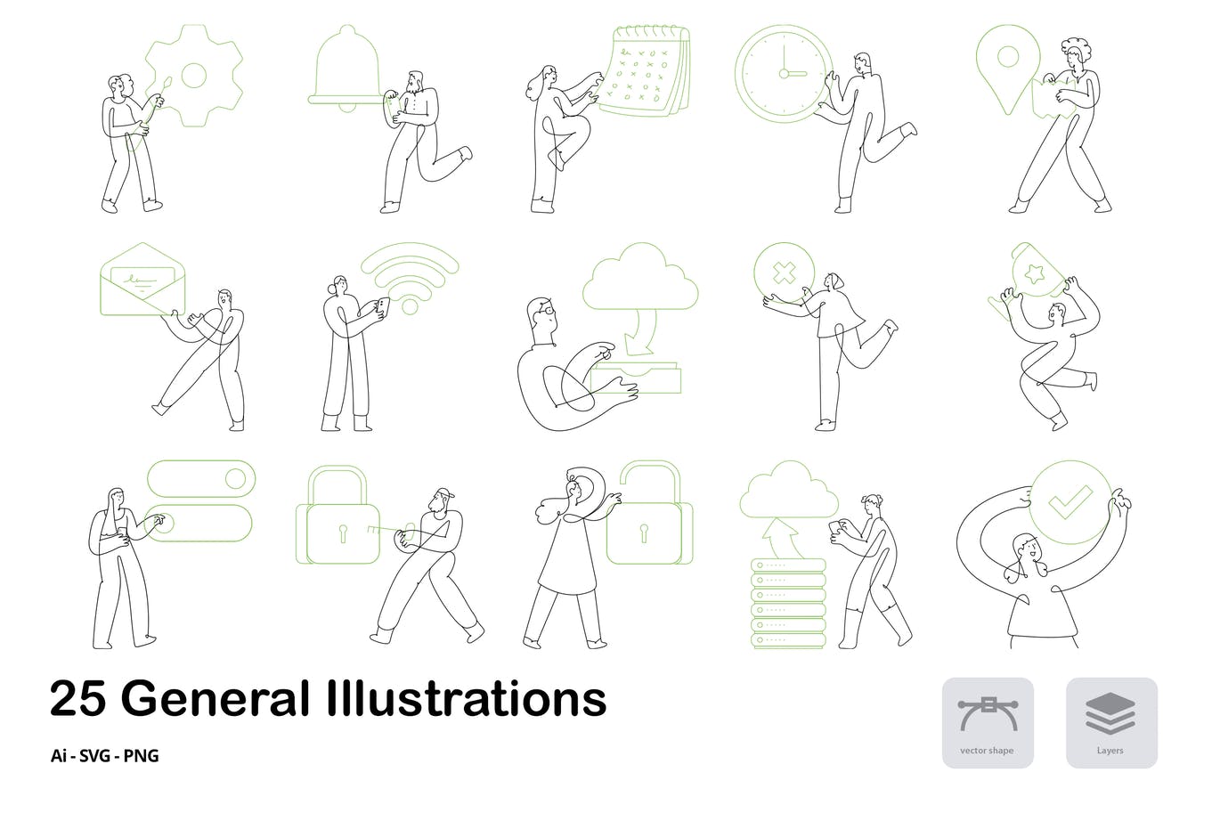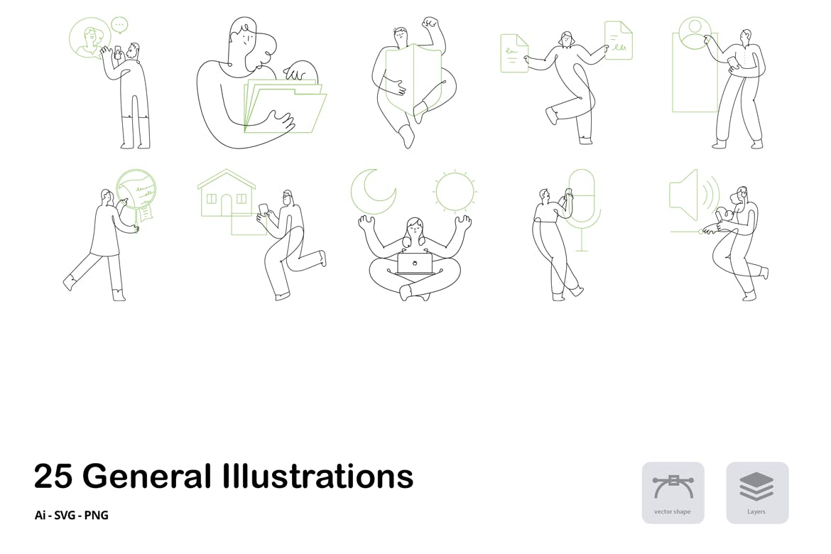 这次老不湿分享的是,25个时尚高端清新简约手绘矢量插画插图图标icon大集合-AI, PNG, SVG,此包包含 25 幅 Garis 将军插图,它们是 Garis 插图包的一部分。这套插图有 AI、SVG、PNG 格式
