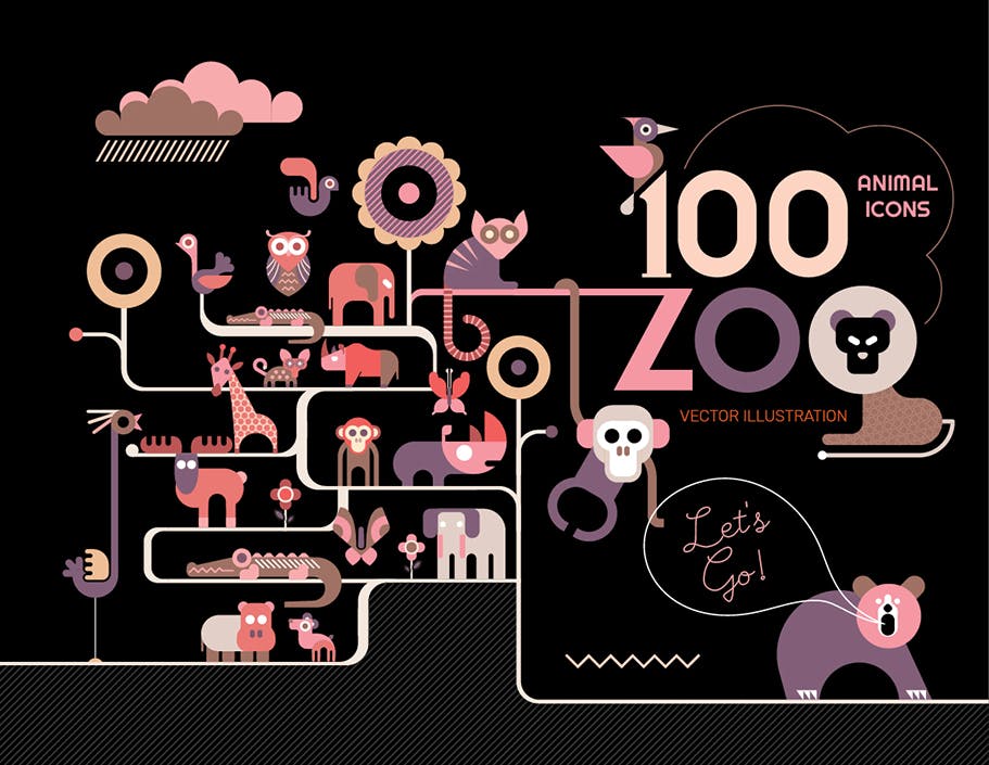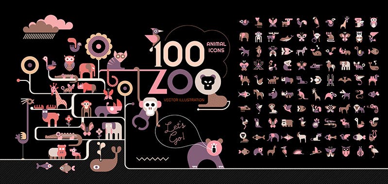 这次老不湿分享的是,100+高端专业扁平化动物园动物图标icon集合- AI,EPS,JPG,PDF,PNG,PSD,SVG,**在黑背景隔绝的巨大套五颜六色的动物园动物传染媒介象。超过100种独特的设计元素。文本和每个图标都是可编辑的,位于单独的图层上。**鳄鱼,犀牛,猴子,马,鱼,熊猫,考拉,驼鹿,鬣狗,豹,蝴蝶,骆驼,甲虫,狗,河马,猫,大象,狮子,狐猴,老虎,浣熊,啄木鸟,琴鸟,长颈鹿,长颈鹿,斑马,鹦鹉,袋鼠,鸟,鲸鱼,海豚,蜻蜓,瓢虫,天鹅,变色龙,山羊,熊,灰熊,蜜蜂,野绵羊,刺猬,公鸡,大黄蜂,蜘蛛,骆驼,鲨鱼,公羊,绵羊,羊肉,海马,猫头鹰,公鸡,公鸡,鹰,毒蛇,蛇,鸵鸟,琴鸟
