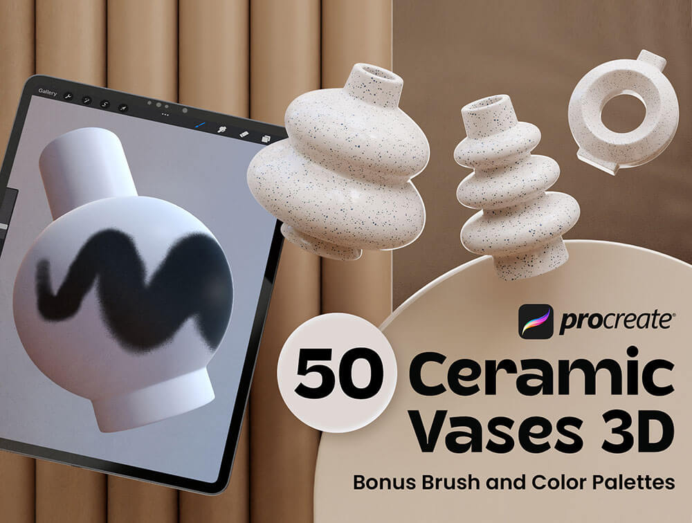 尝试使用这些 3D 模型在 Procreate 中发挥 3D 功能的创意!采用完整的技术和精心制作,每个人都非常容易使用。配备画笔,为您拥有的 3D 花瓶对象添加创作!