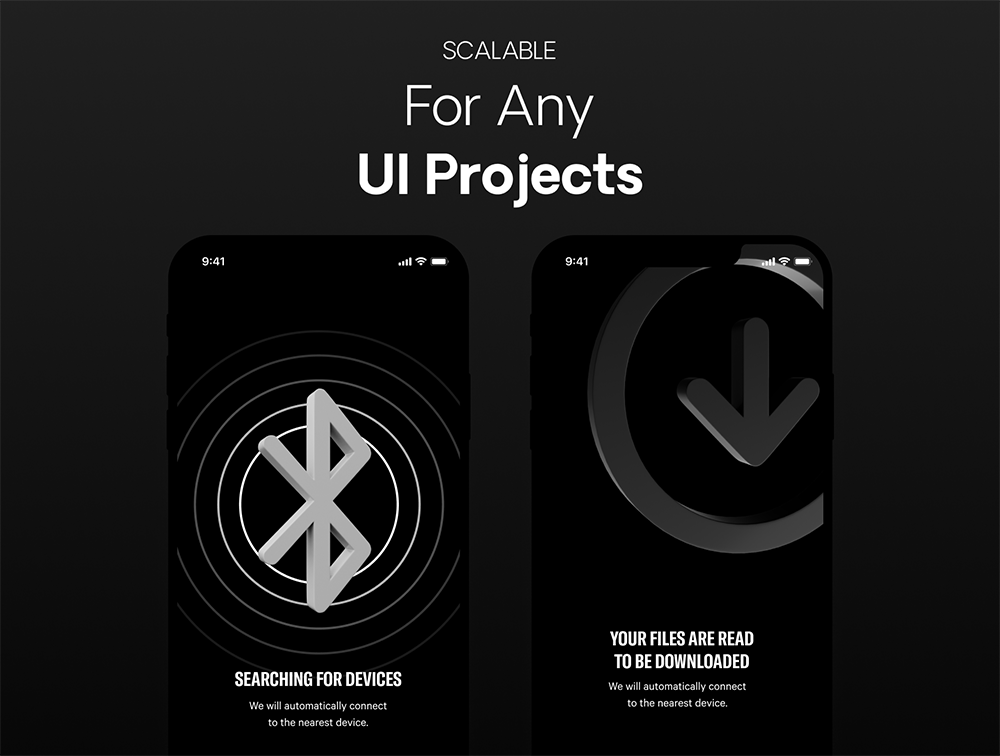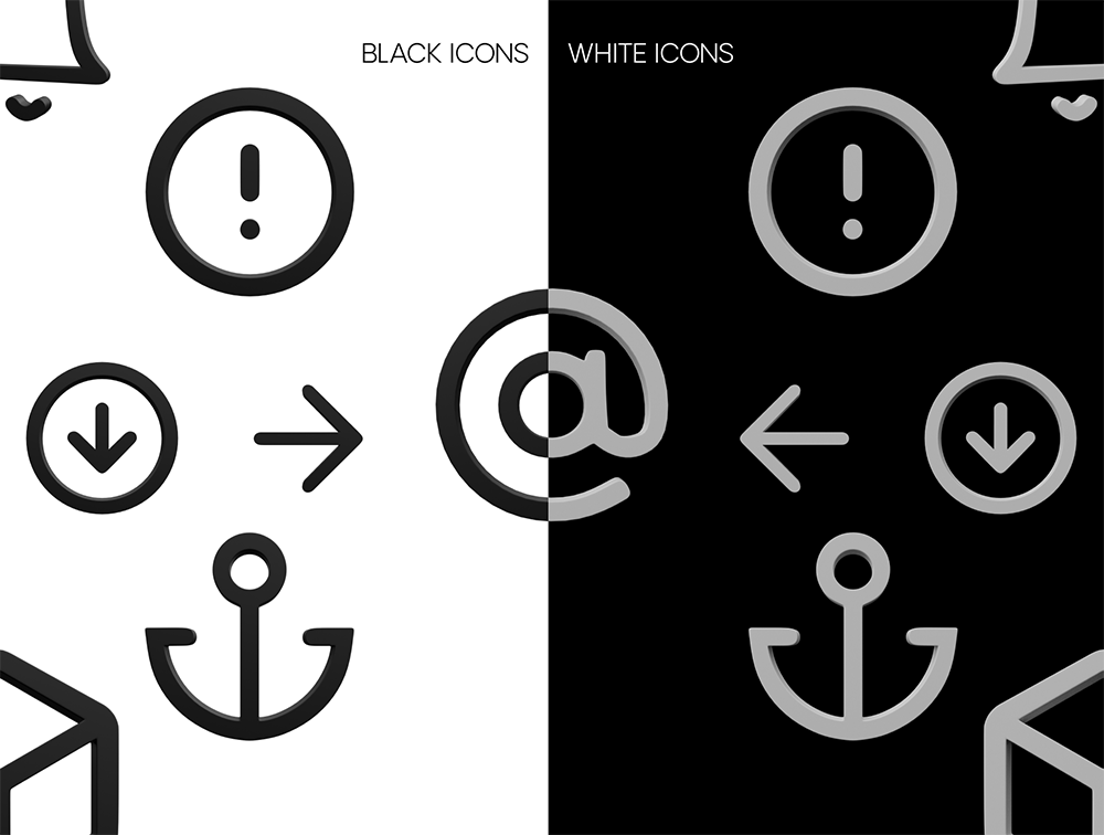 黑白风格手机UI设计3D图标包,可以更改颜色。这些图标非常适合任何 UI 项目或演示文稿。