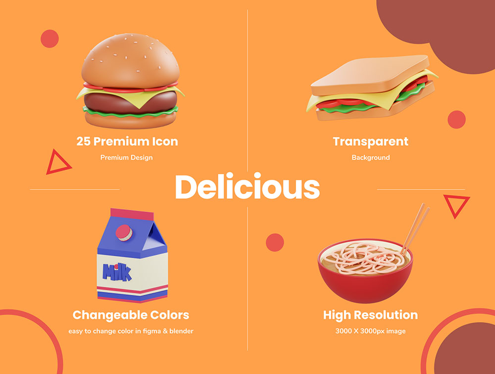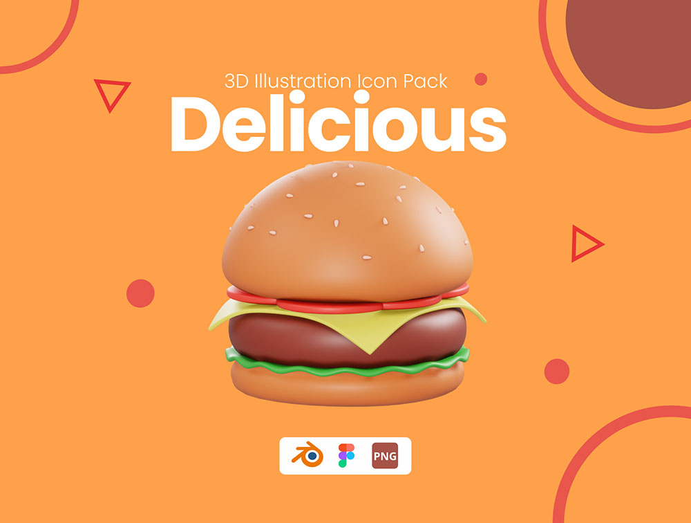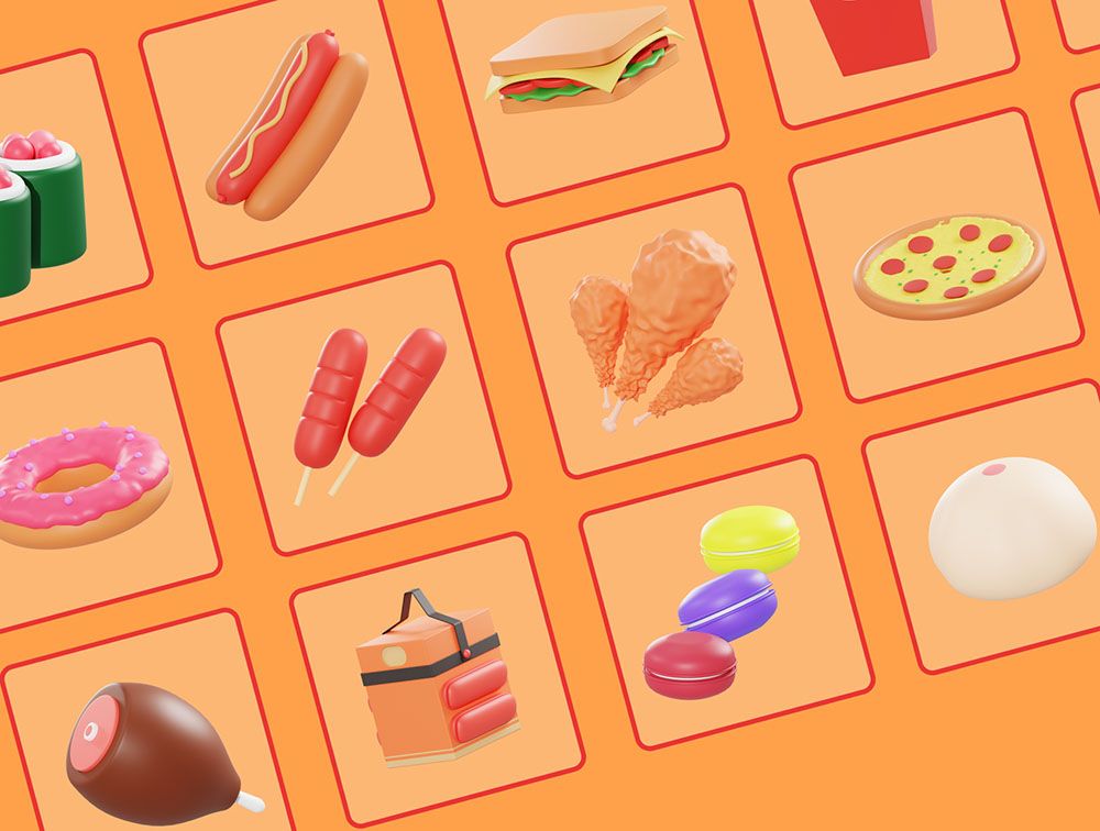 美味食物3D插画图标包,可用于任何项目。包括 20 个高级图标,在 Figma 中具有可变颜色的高品质。包含 Blender 文件、Figma 和 PNG 图像。