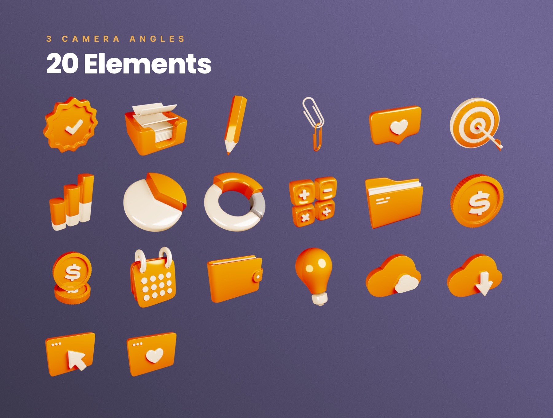 一组可定制的商业主题3D元素。包含20个元素,每个元素都提供三种不同的相机角度以适合您的构图。由于高分辨率(高达 4000×4000 像素),元素适用于任何类型的媒体:着陆页、移动应用程序、演示文稿等。