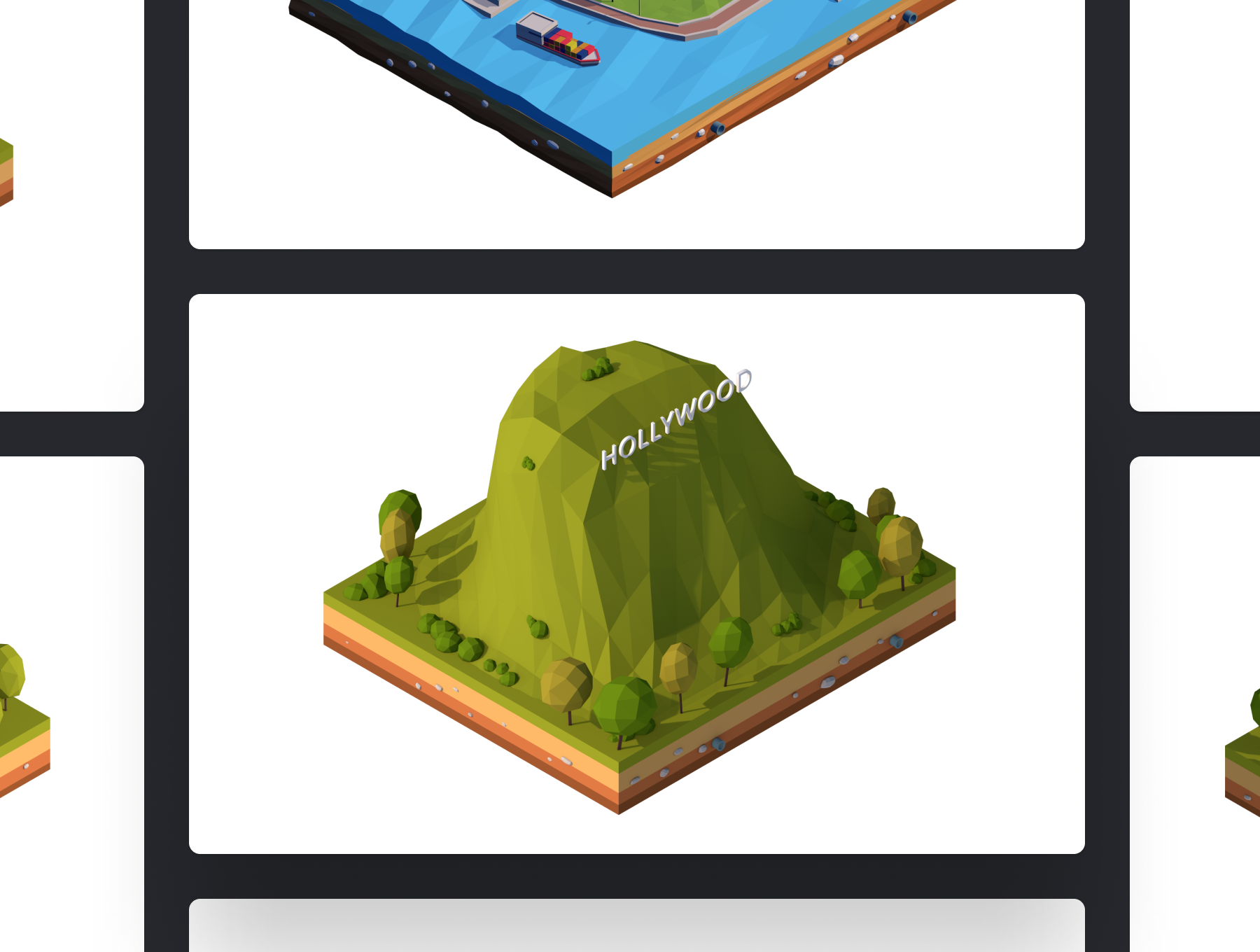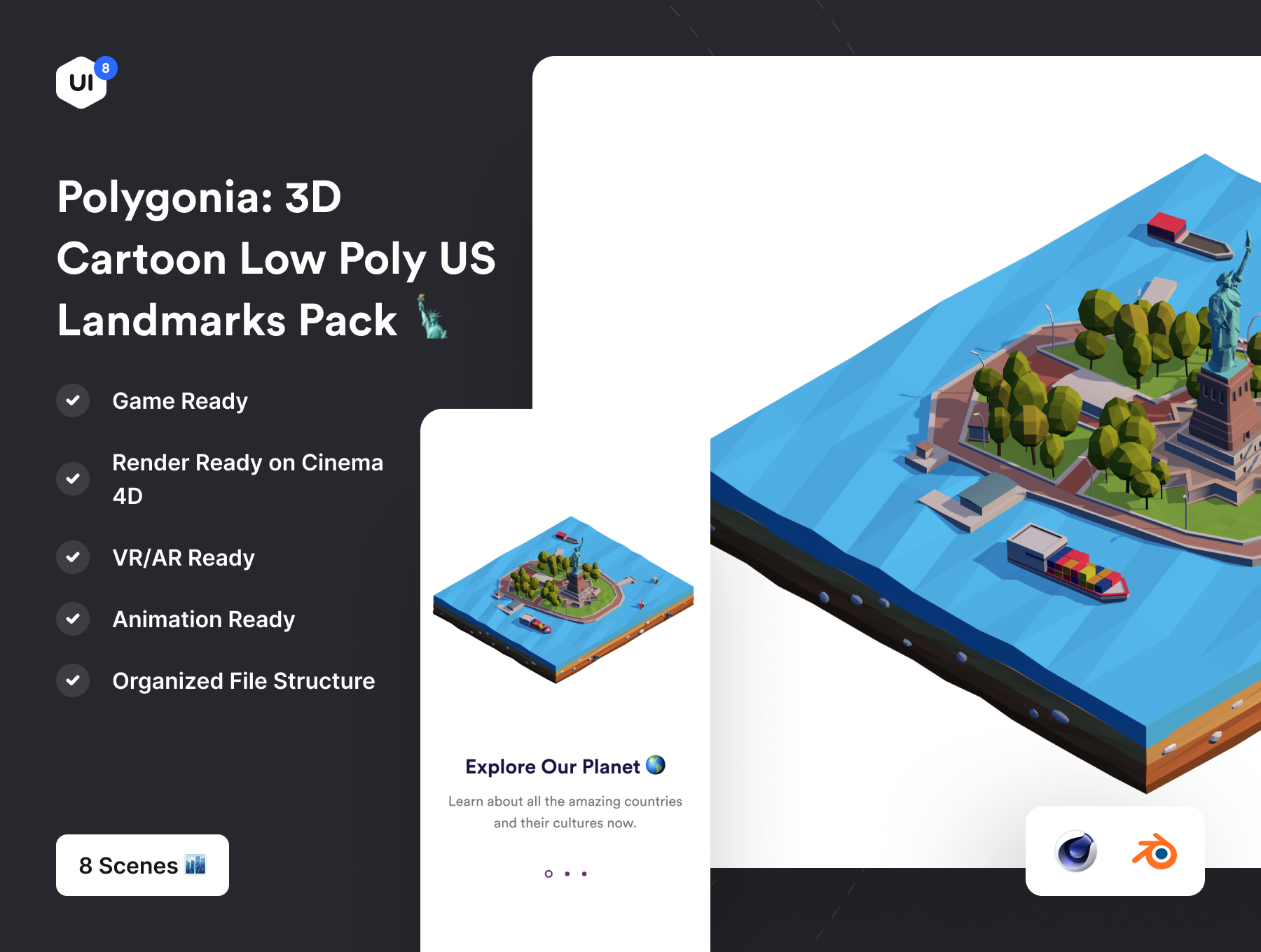 在Cinema 4d R20上创建的3D资产,包括:纪念碑谷,好莱坞标志,国会大厦,华盛顿纪念碑,帝国大厦,自由女神像,巨型地球仪纪念碑,拉什莫尔山。