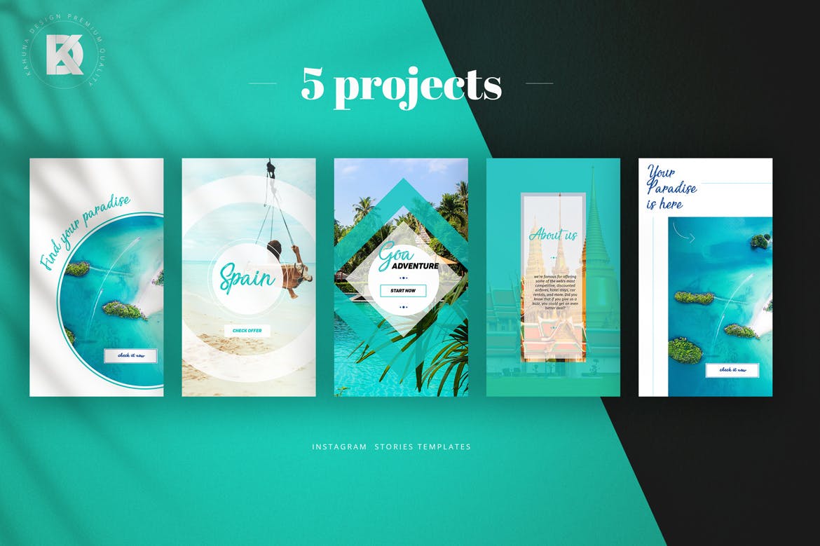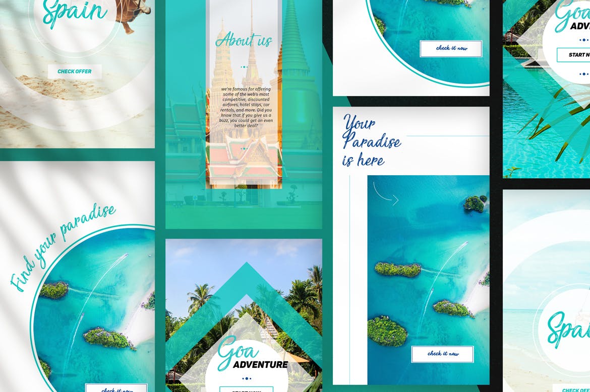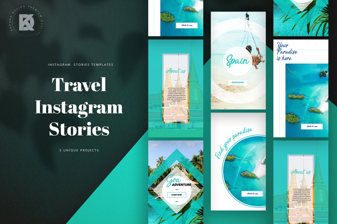 这次老不湿分享的是,时尚高端清新多用途的高品质旅游社交媒体Instagram海报banner设计模板,旅行Instagram故事包含1920×1080 px格式的5个设计。