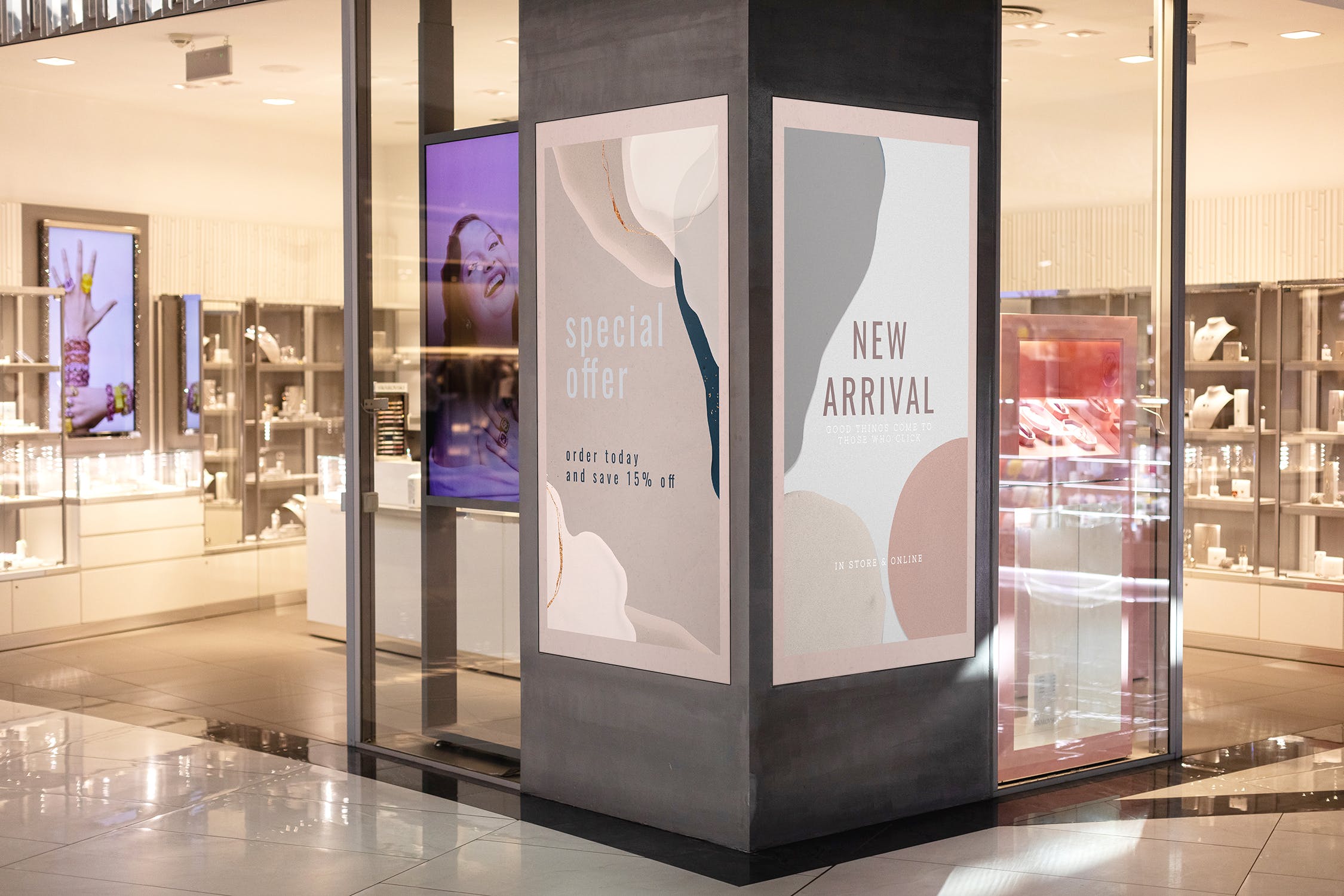 2个购物中心广告Banner横幅/海报样机,用于展示您的活动、海报设计、广告、艺术品、电影、节日等。旨在以逼真的外观展示您的图形设计、界面、web、应用程序、照片、软件和艺术品。手工制作,节省您的时间。只需点击几下就可以轻松编辑!