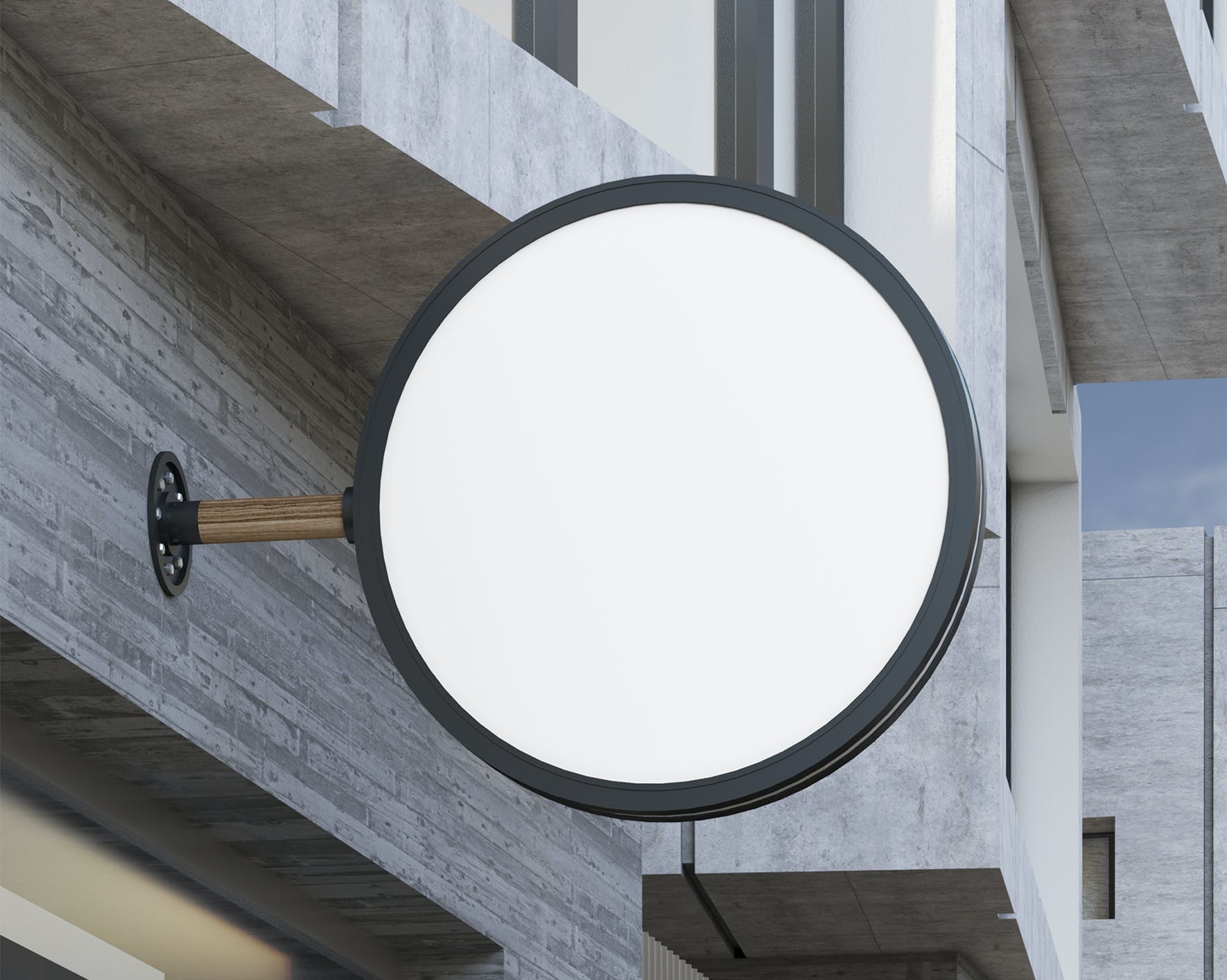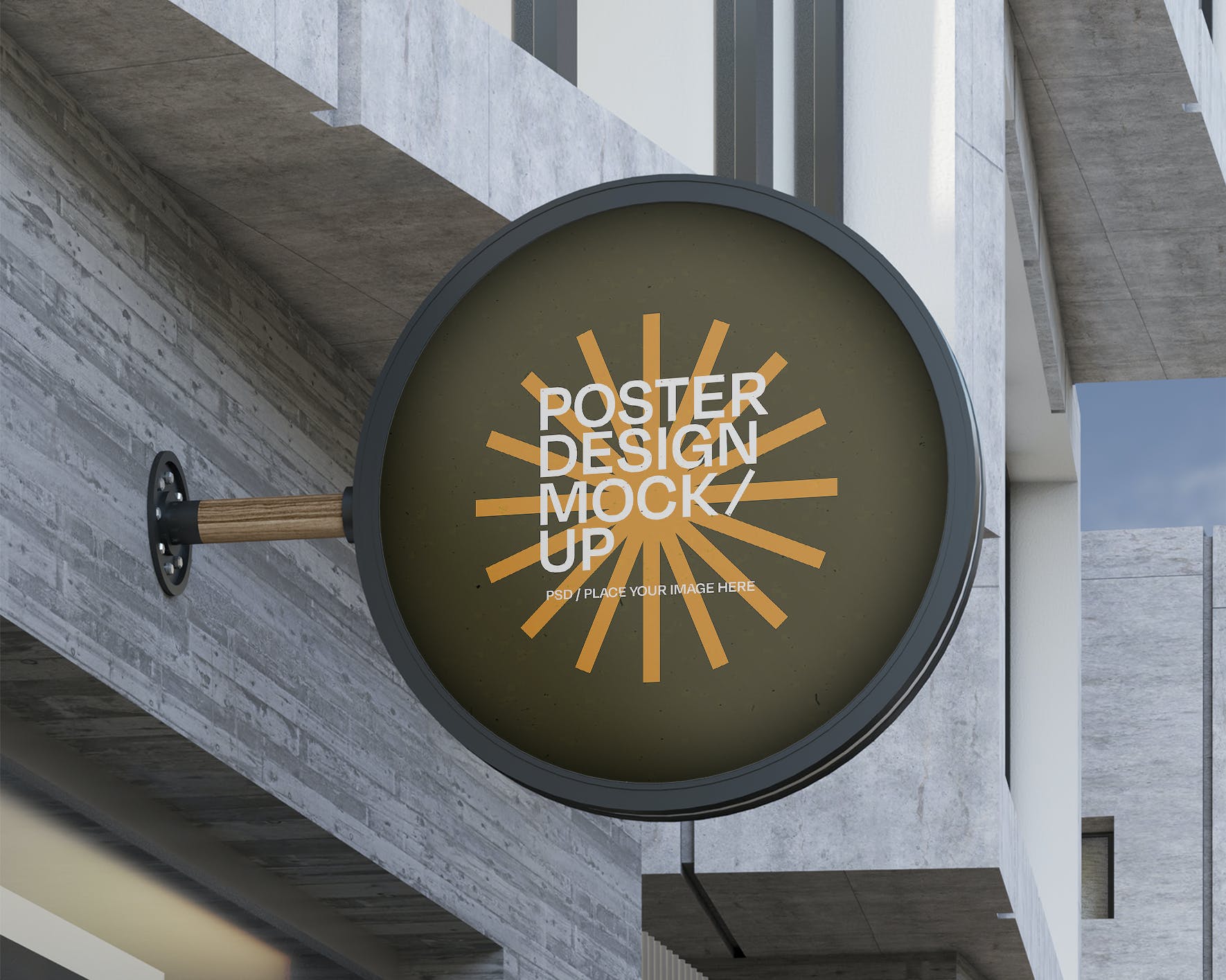 圆形广告招牌海报样机,模板上有一个智能对象可帮助您调整设计。只需拖放即可。使用起来非常简单。使用纯色图层易于重新着色。高分辨率 (300 dpi) 。