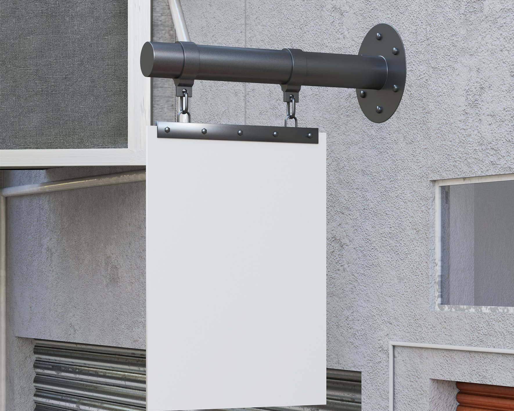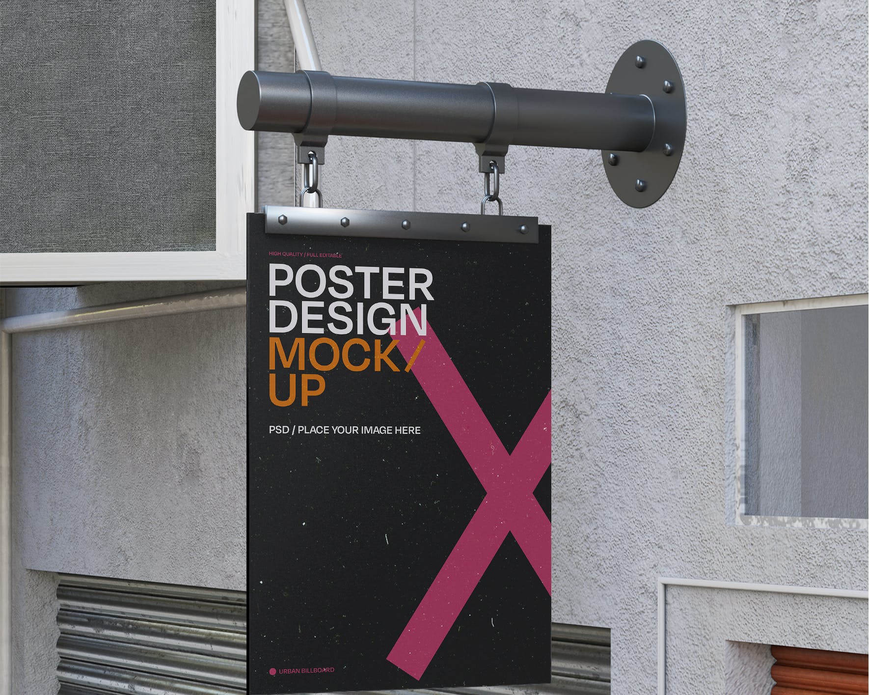 吊挂广告牌海报样机,模板上有一个智能对象可帮助您调整设计。只需拖放即可。使用起来非常简单。使用纯色图层易于重新着色。高分辨率 (300 dpi) 。