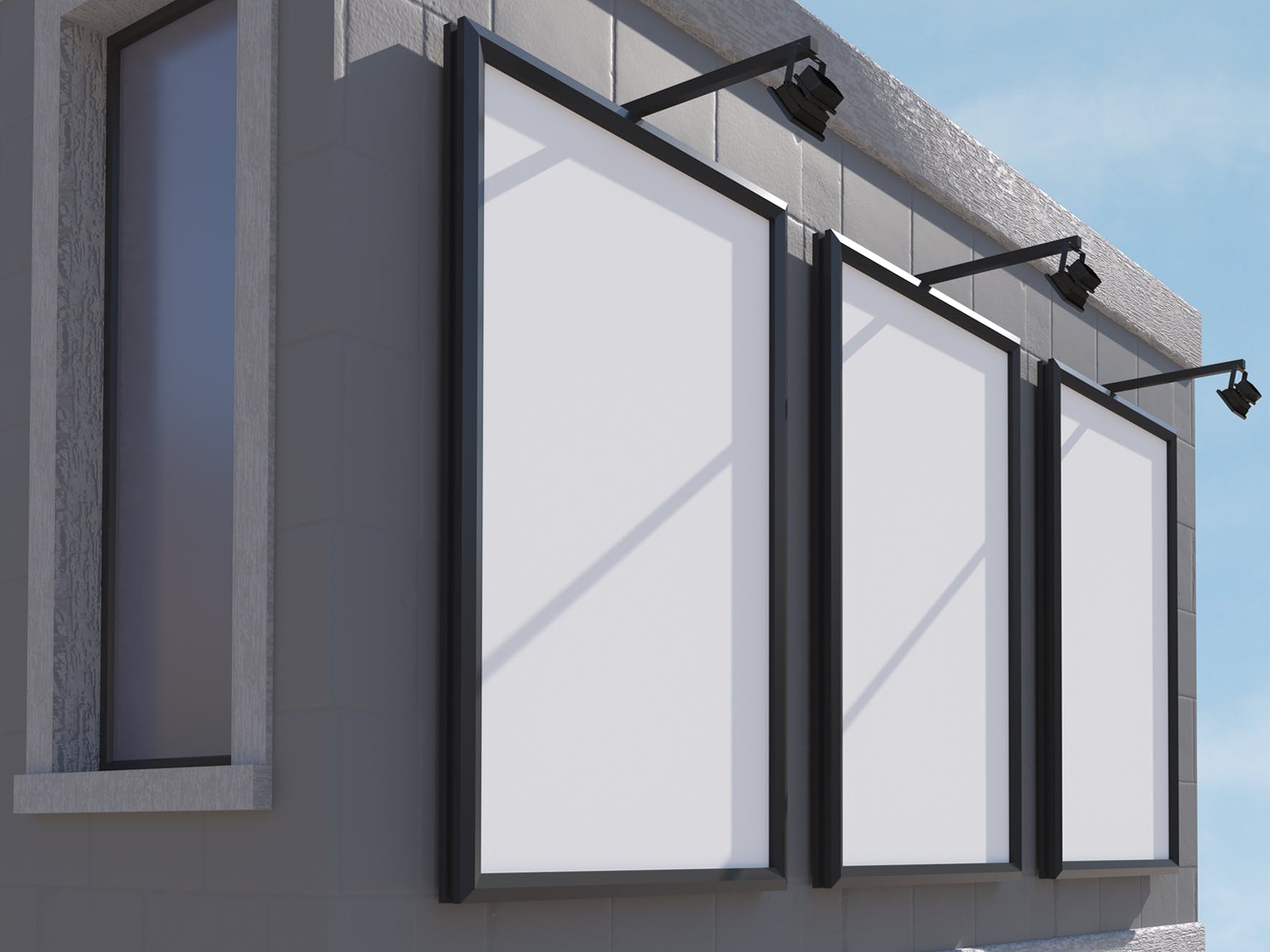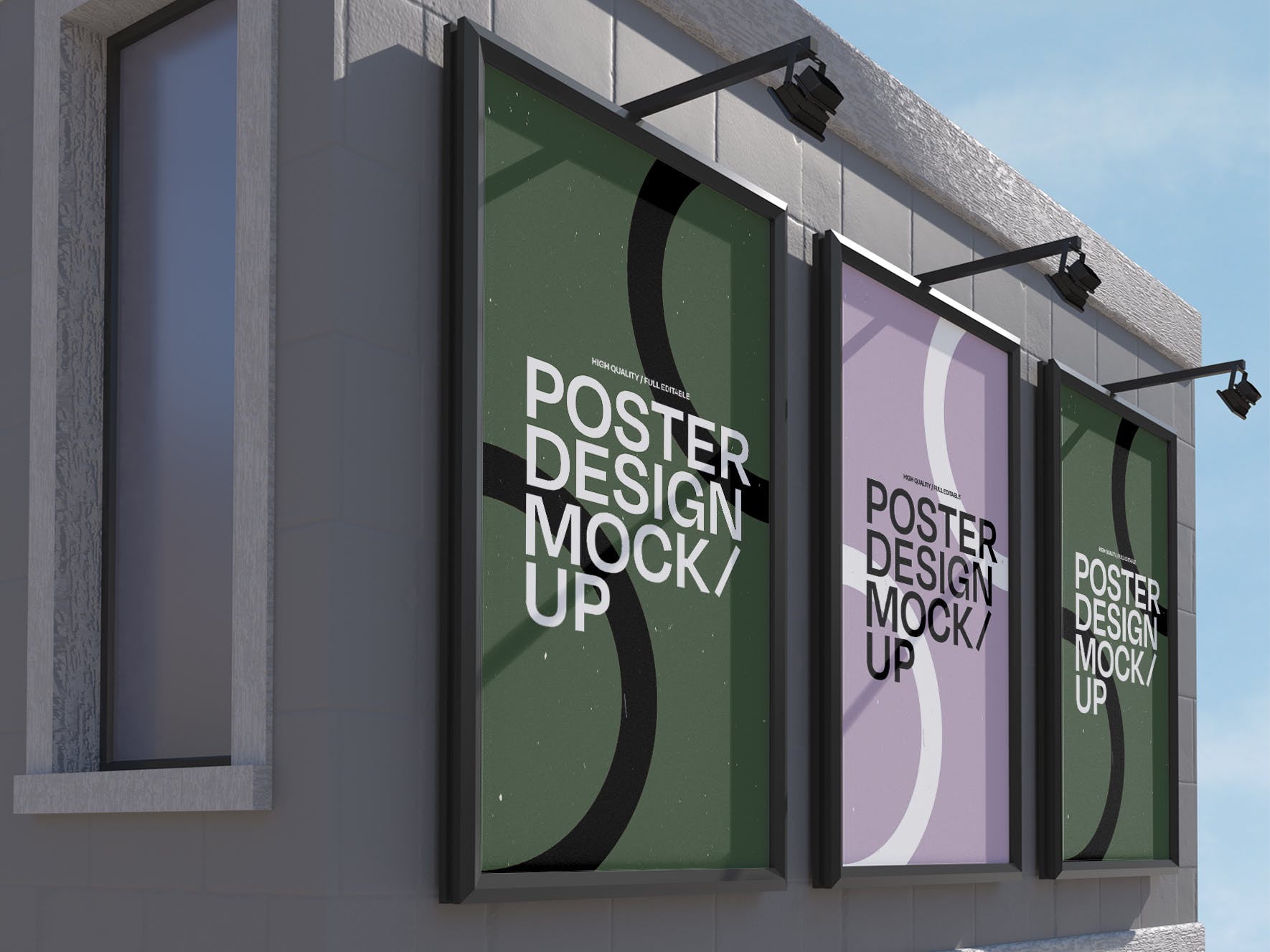 三个框架广告牌海报样机,模板上有一个智能对象可帮助您调整设计。只需拖放即可。使用起来非常简单。使用纯色图层易于重新着色。高分辨率 (300 dpi) 。