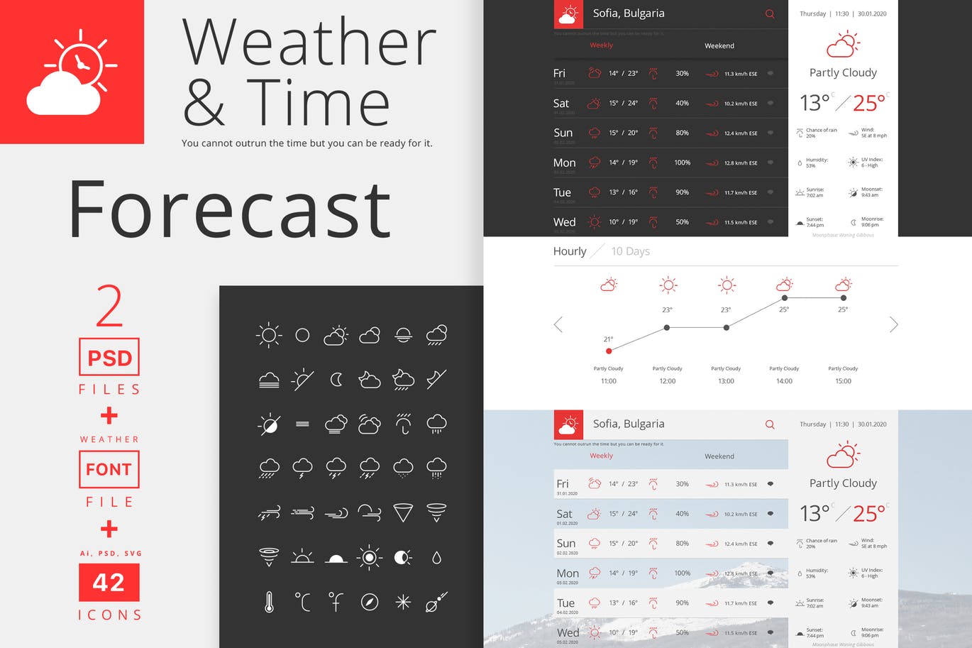 天气预报和时间-2个PSD文件+天气字体+ 42个Ai,PSD,SVG格式的矢量图标