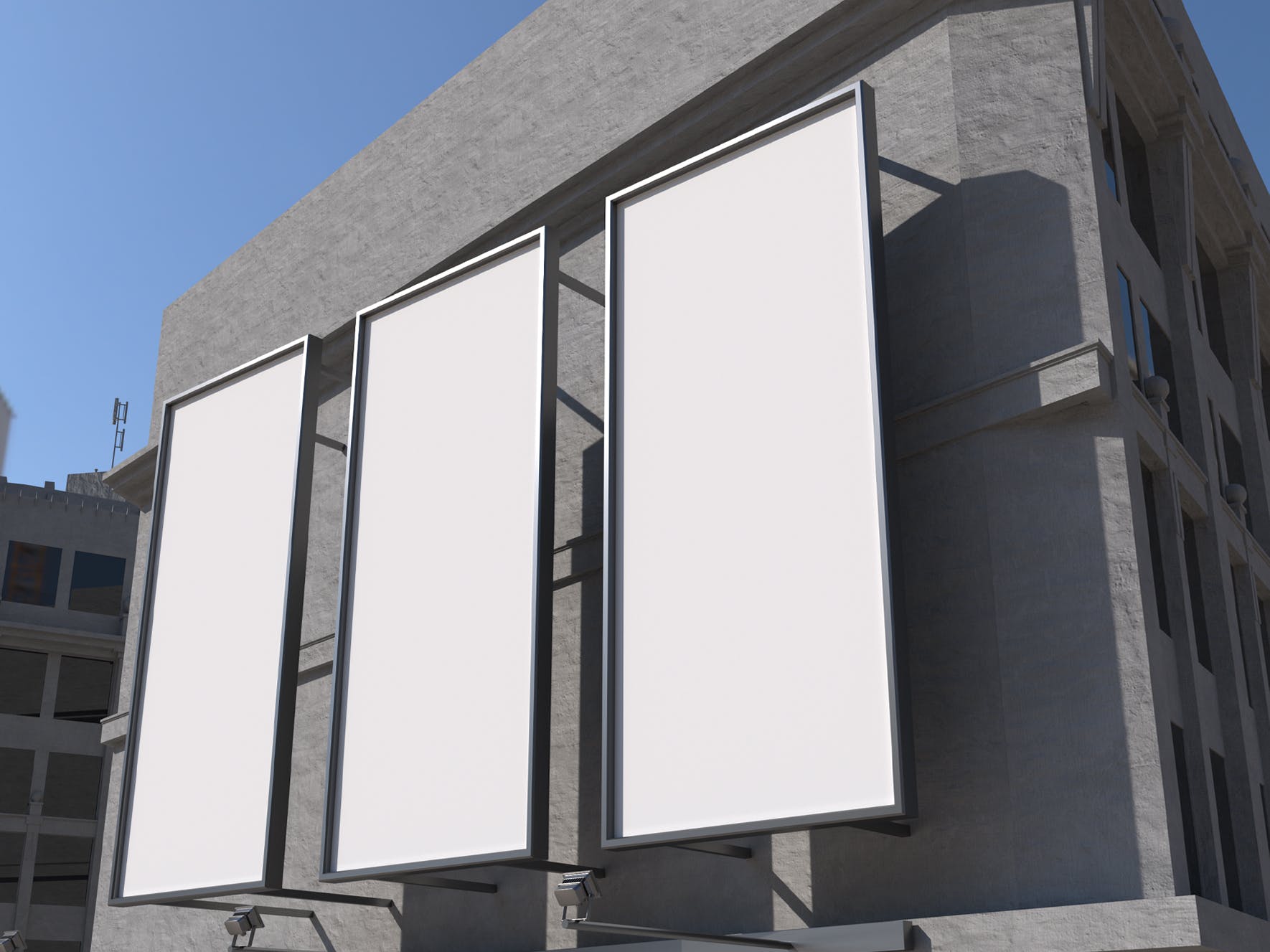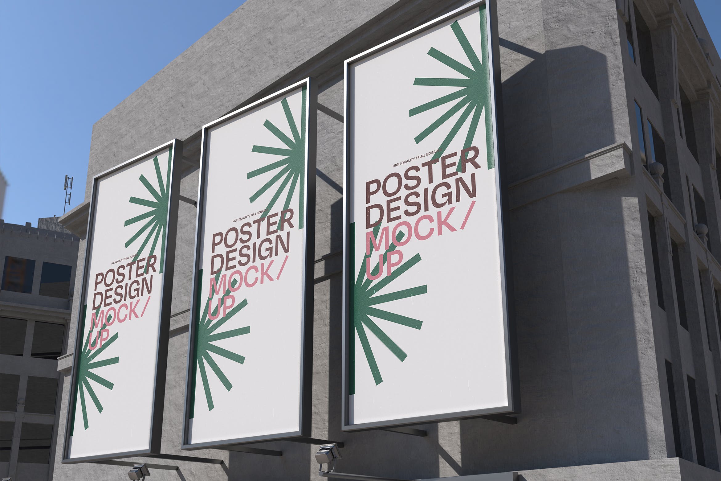 三个矩形广告牌海报样机,模板上有一个智能对象可帮助您调整设计。只需拖放即可。使用起来非常简单。使用纯色图层易于重新着色。高分辨率 (300 dpi) 。