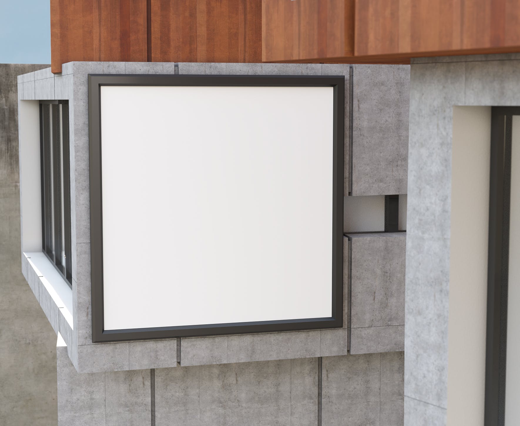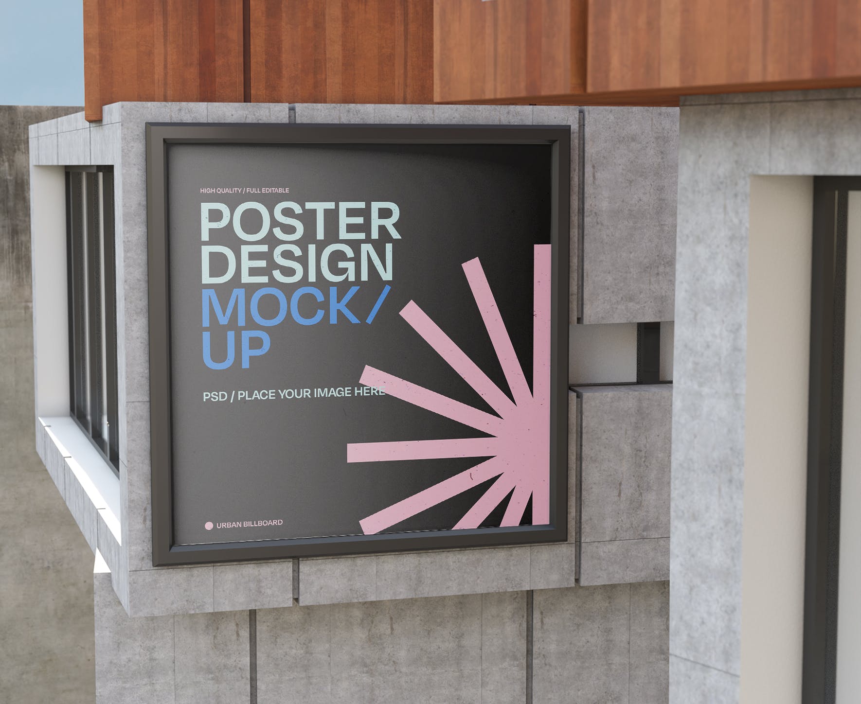 建筑外墙方形广告海报样机,模板上有一个智能对象可帮助您调整设计。只需拖放即可。使用起来非常简单。使用纯色图层易于重新着色。高分辨率 (300 dpi) 。