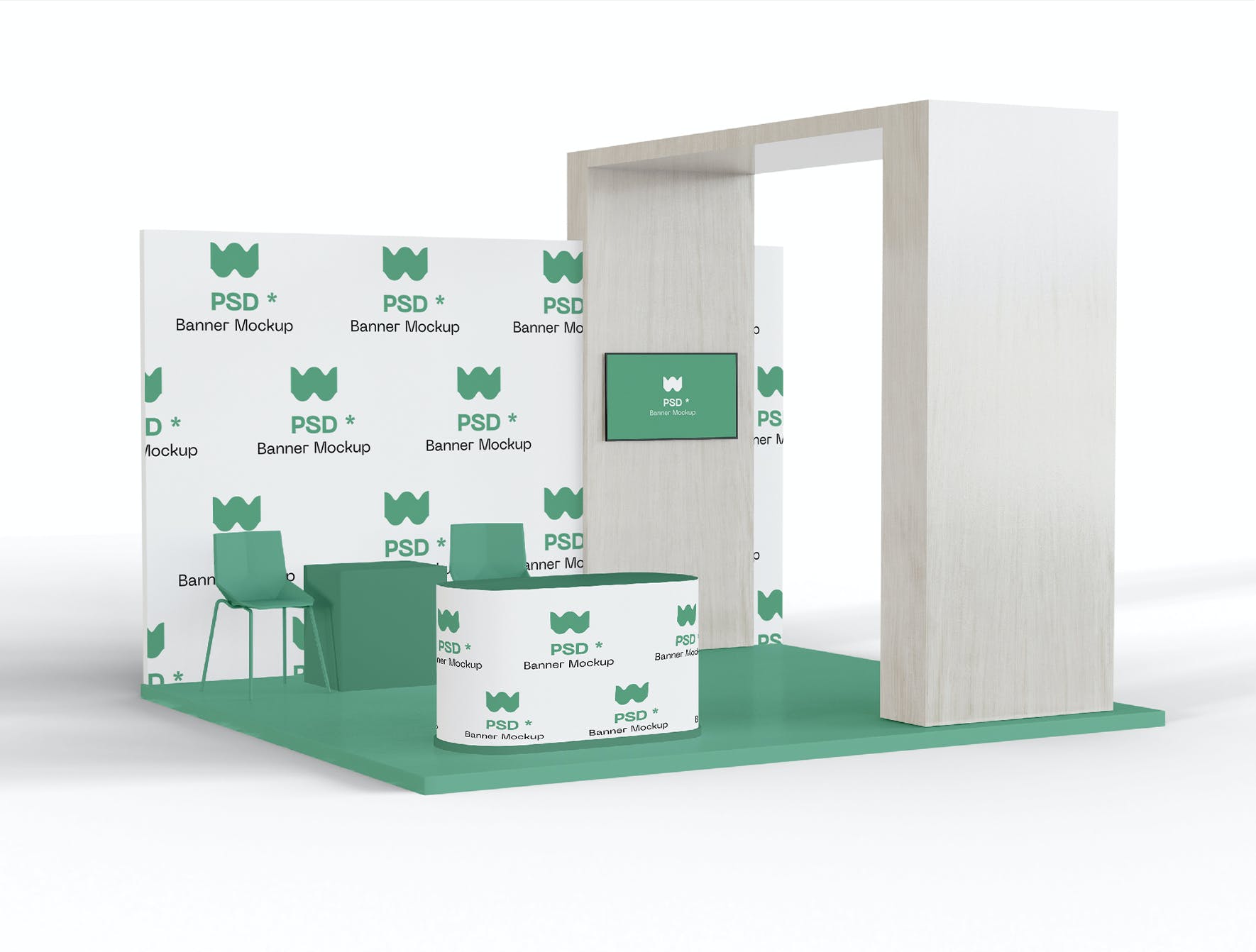 展览馆展台广告设计样机素材,样机上有一个智能对象,可帮助您调整设计。 只需将其拖放即可。 使用起来非常简单。 通过使用纯色图层,易于重新着色。高分辨率(300 dpi)。 享受优质的品质!下载文件中不包含样本设计。