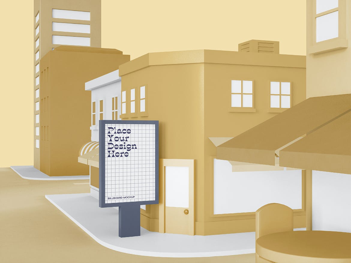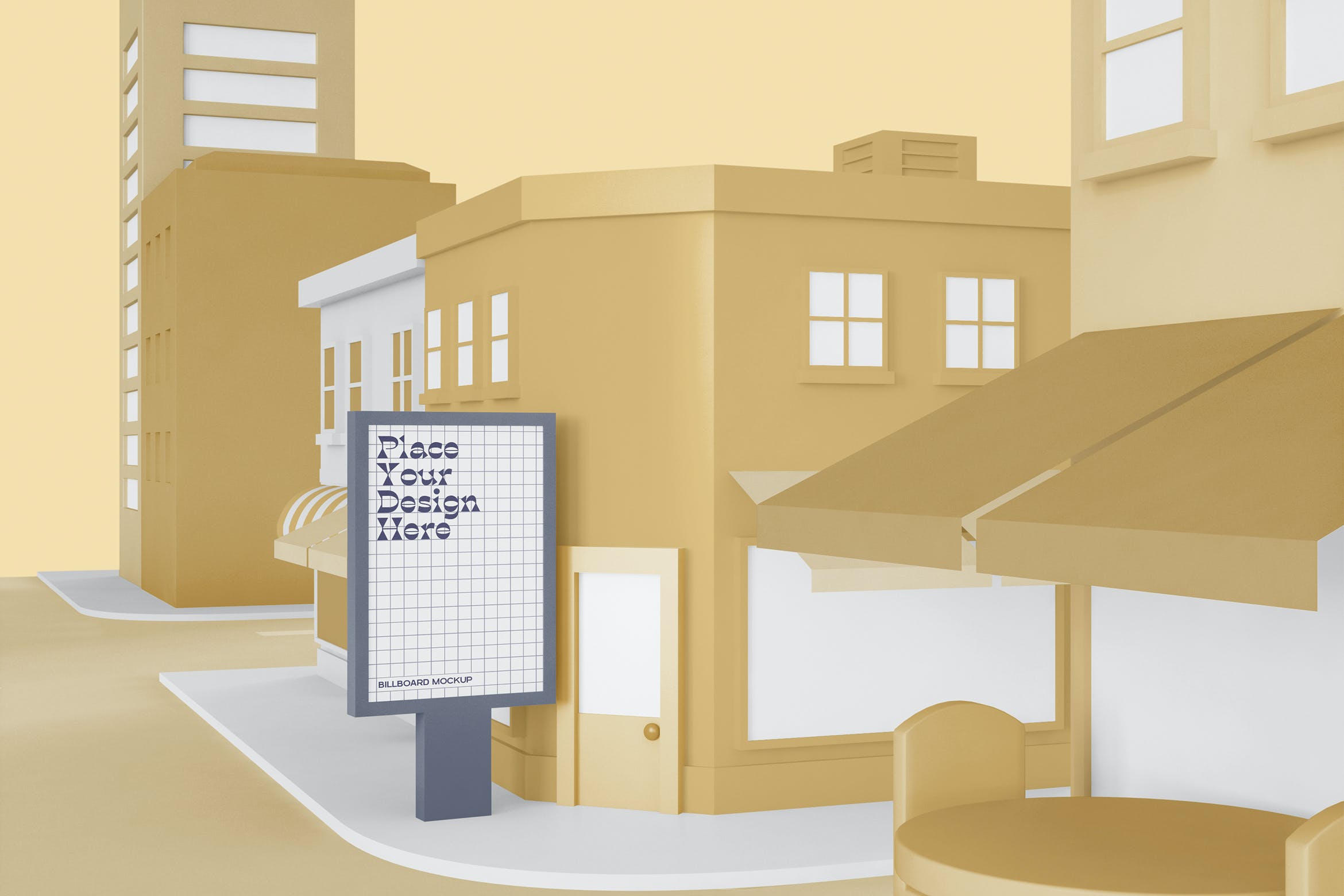 3D场景购物商店广告牌样机,样机上有一个智能对象,可帮助您调整设计。 只需将其拖放即可。 使用起来非常简单。 通过使用纯色图层,易于重新着色。高分辨率(300 dpi)。 享受优质的品质!下载文件中不包含样本设计。