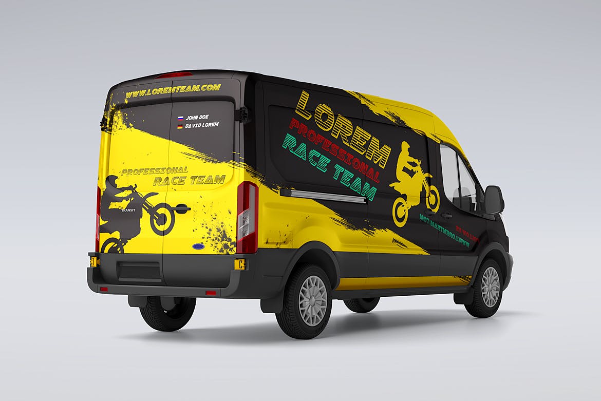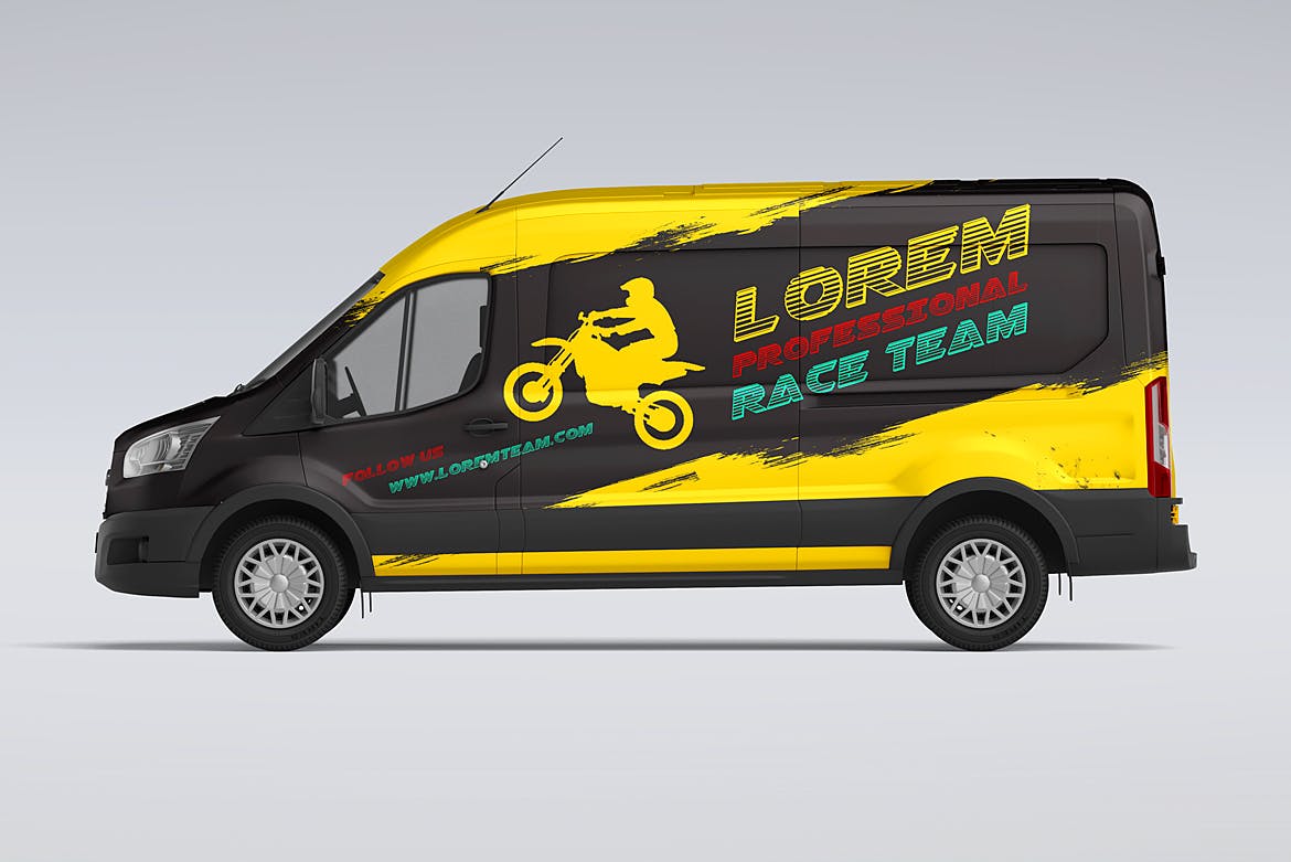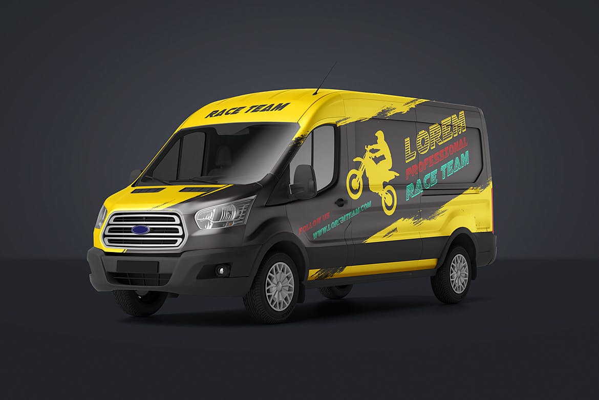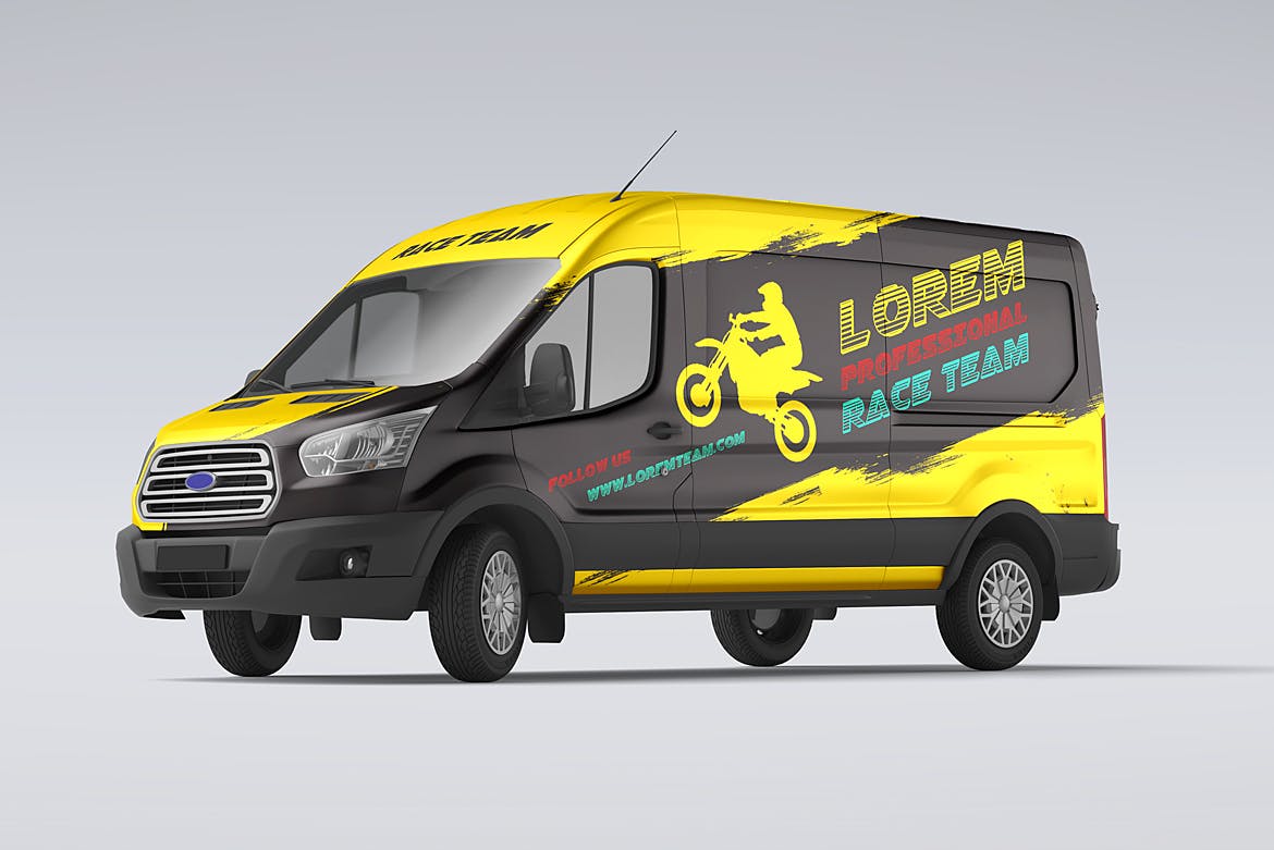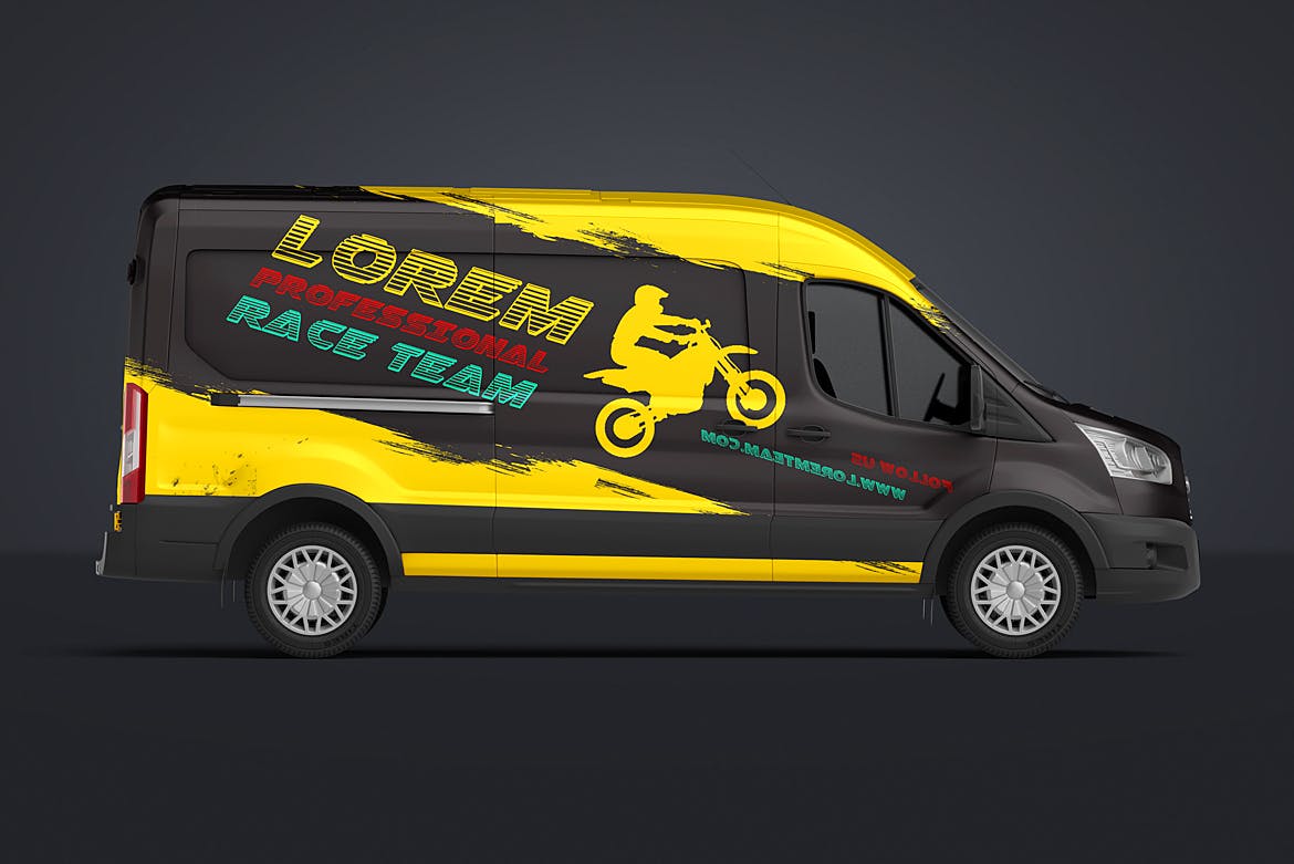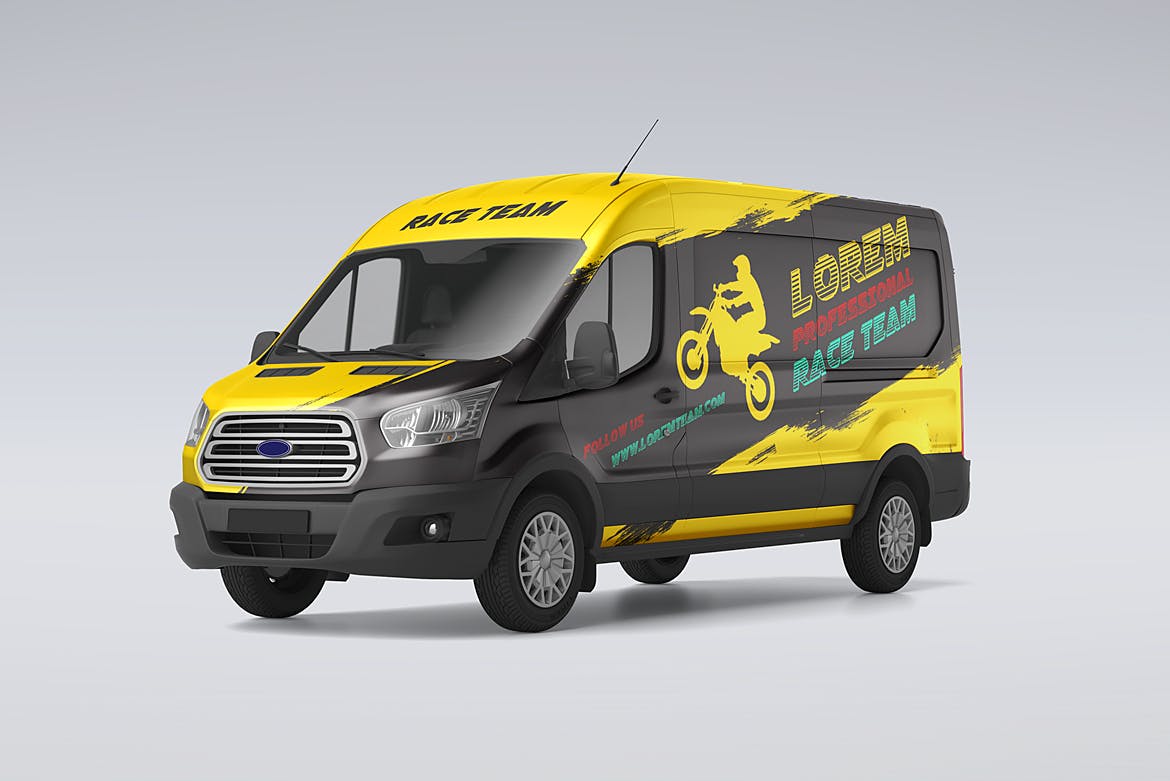 一套8个逼真且易于编辑的面包车多角度广告展示设计样机。