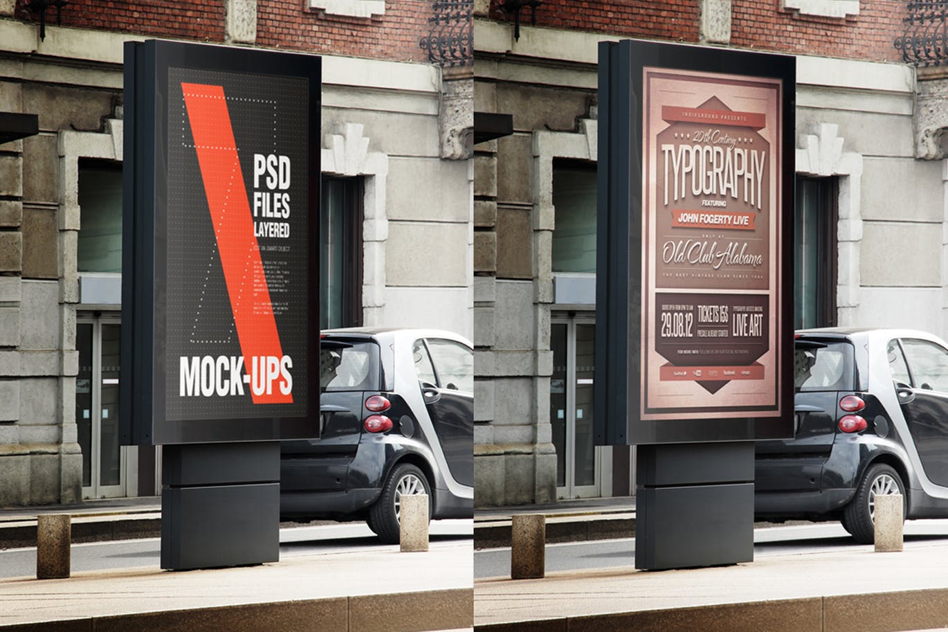 1个用于您的传单、海报和广告的城市海报设计效果图预览样机,通过智能对象进行样机工作:您不需要任何Photoshop技能,只需将设计放入智能对象中,它就会自动更新样机。