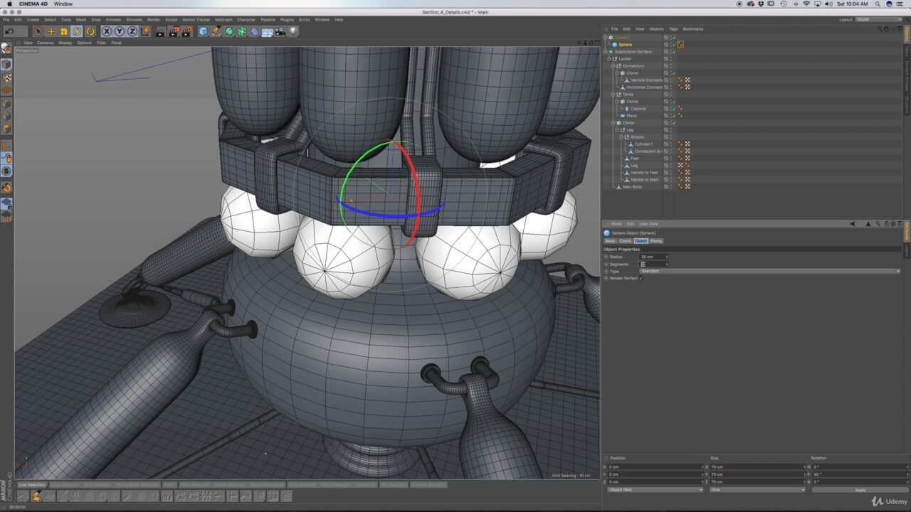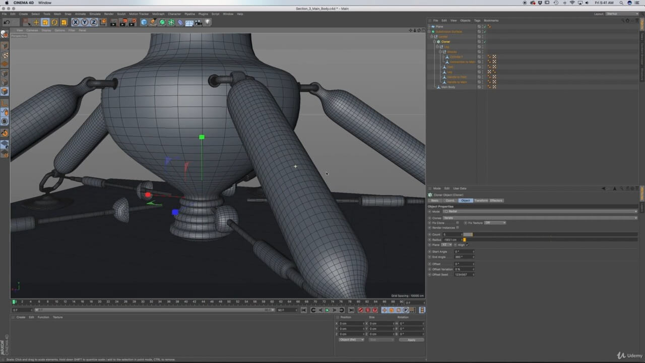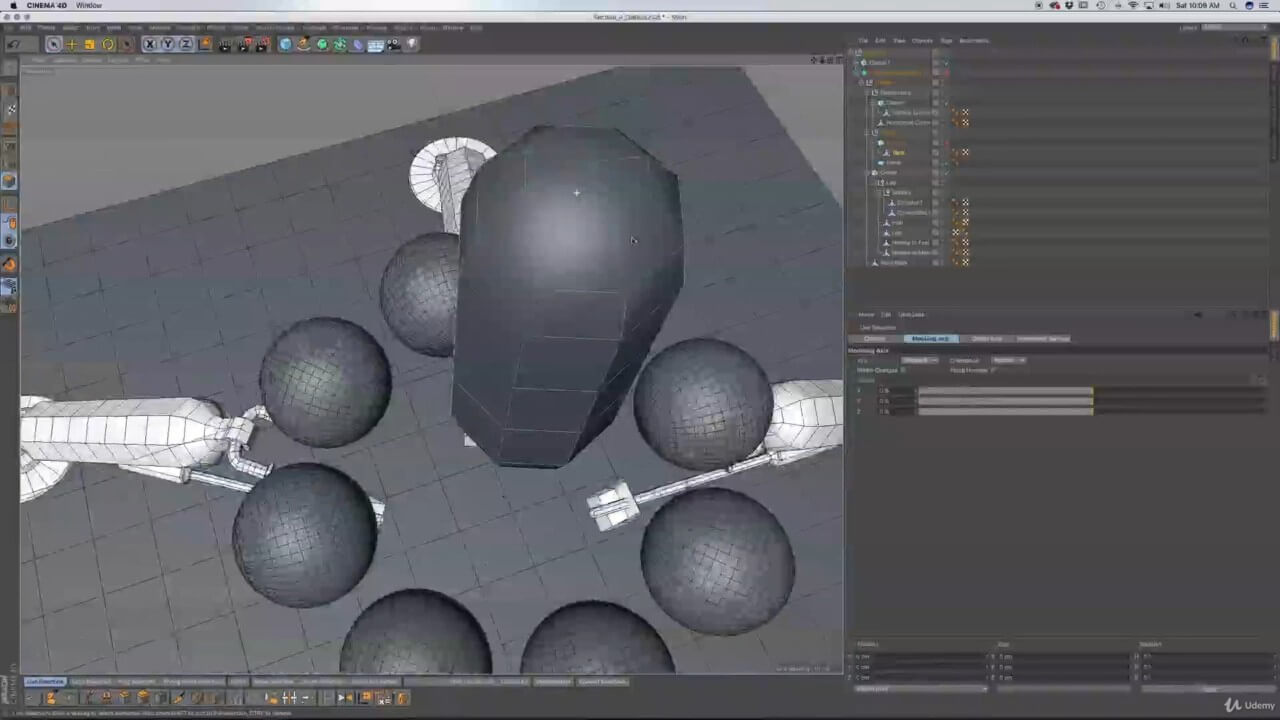 你将学习:基元、拉伸、挤压内心、斜角、切割工具、循环选择、现场选择、MoGraph Cloner、分裂、断开、细分曲面。