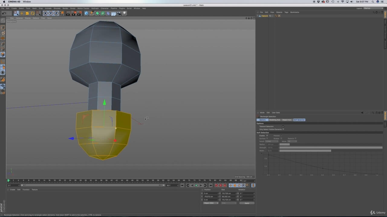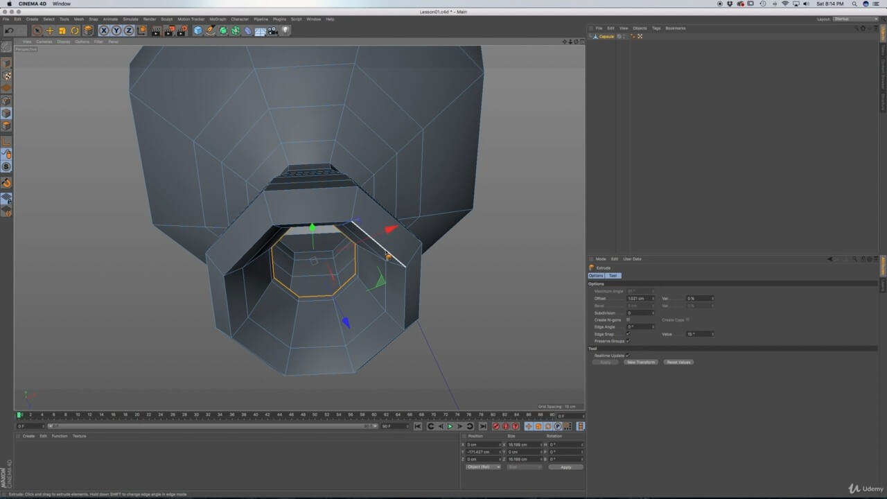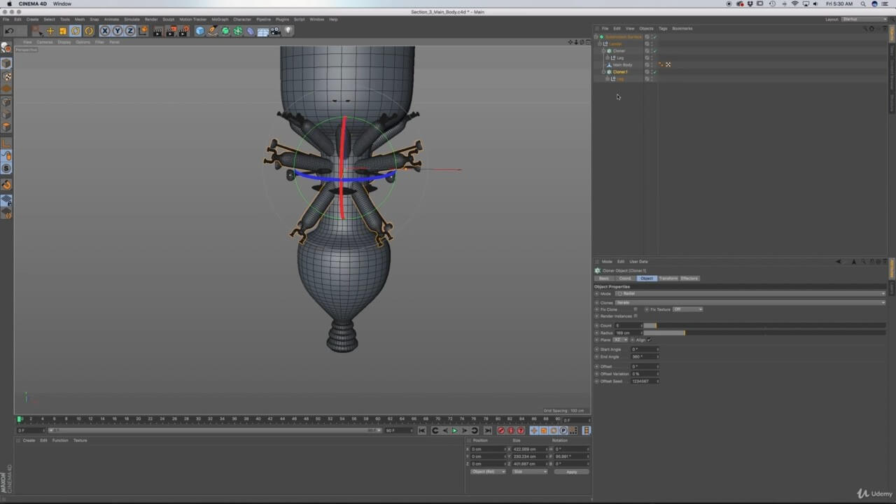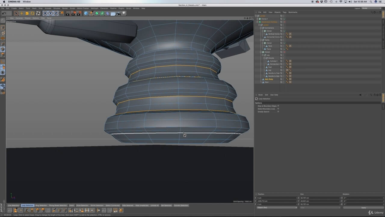 你将学习:基元、拉伸、挤压内心、斜角、切割工具、循环选择、现场选择、MoGraph Cloner、分裂、断开、细分曲面。