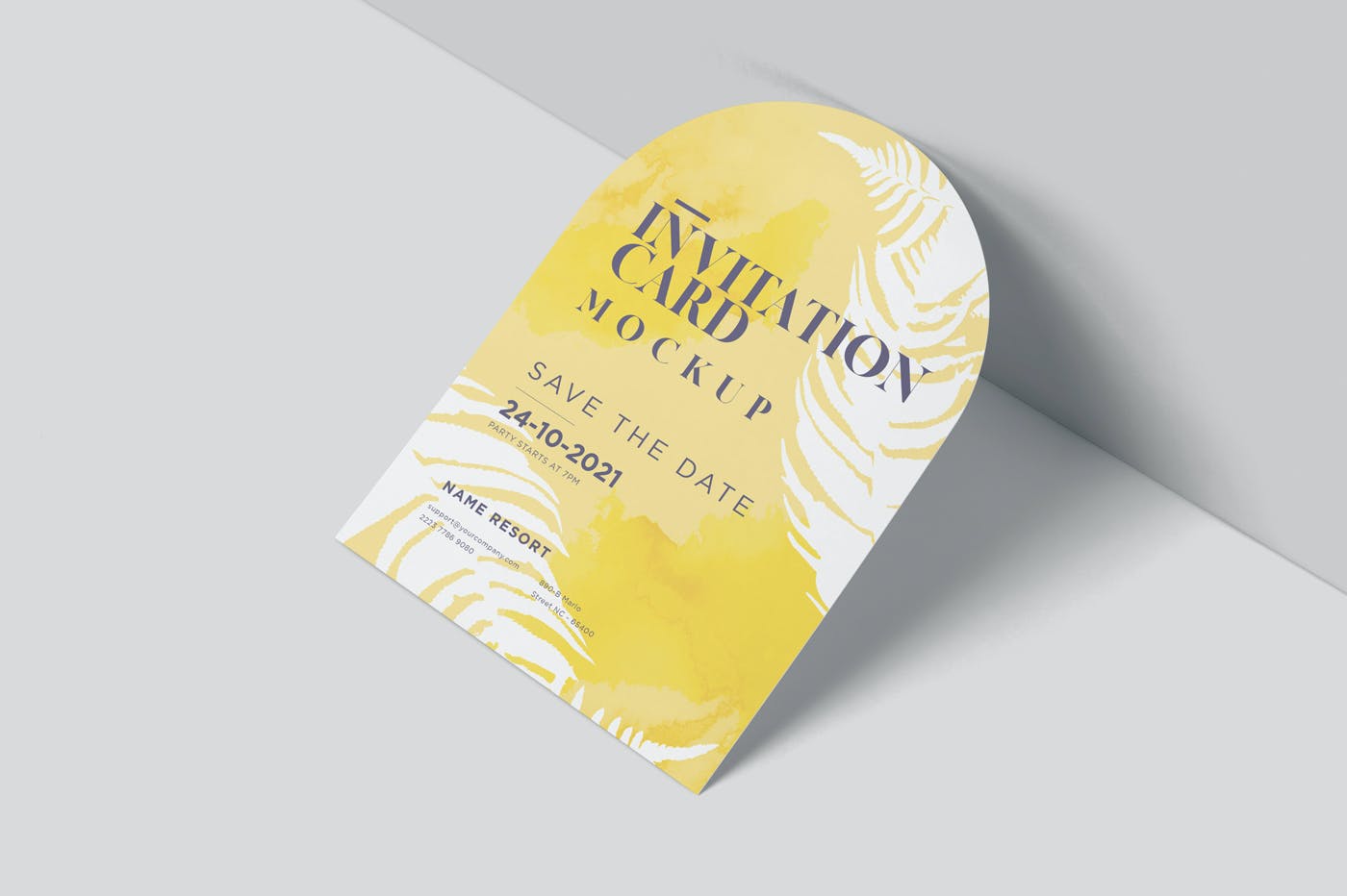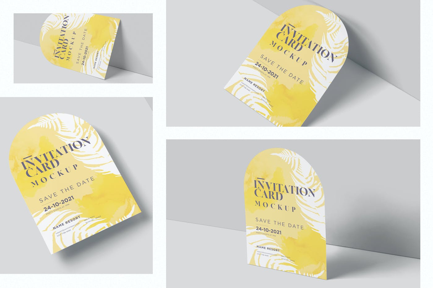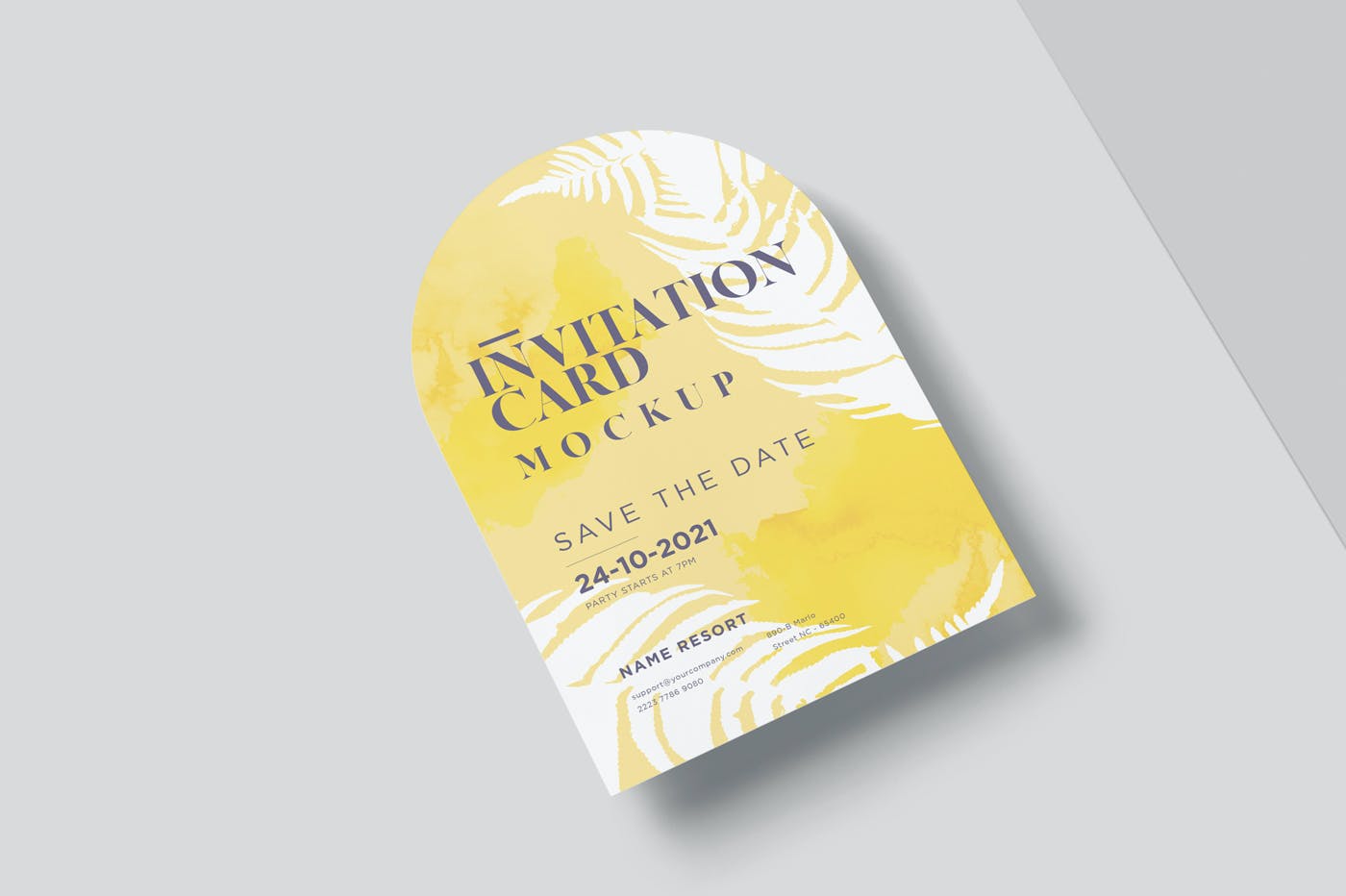 弓形邀请卡设计样机模板,使您能够惊人地展示您的问候和邀请品牌设计。具有智能对象选项和管理良好的图层,让您只需单击一下即可自定义设计、颜色、阴影和背景。