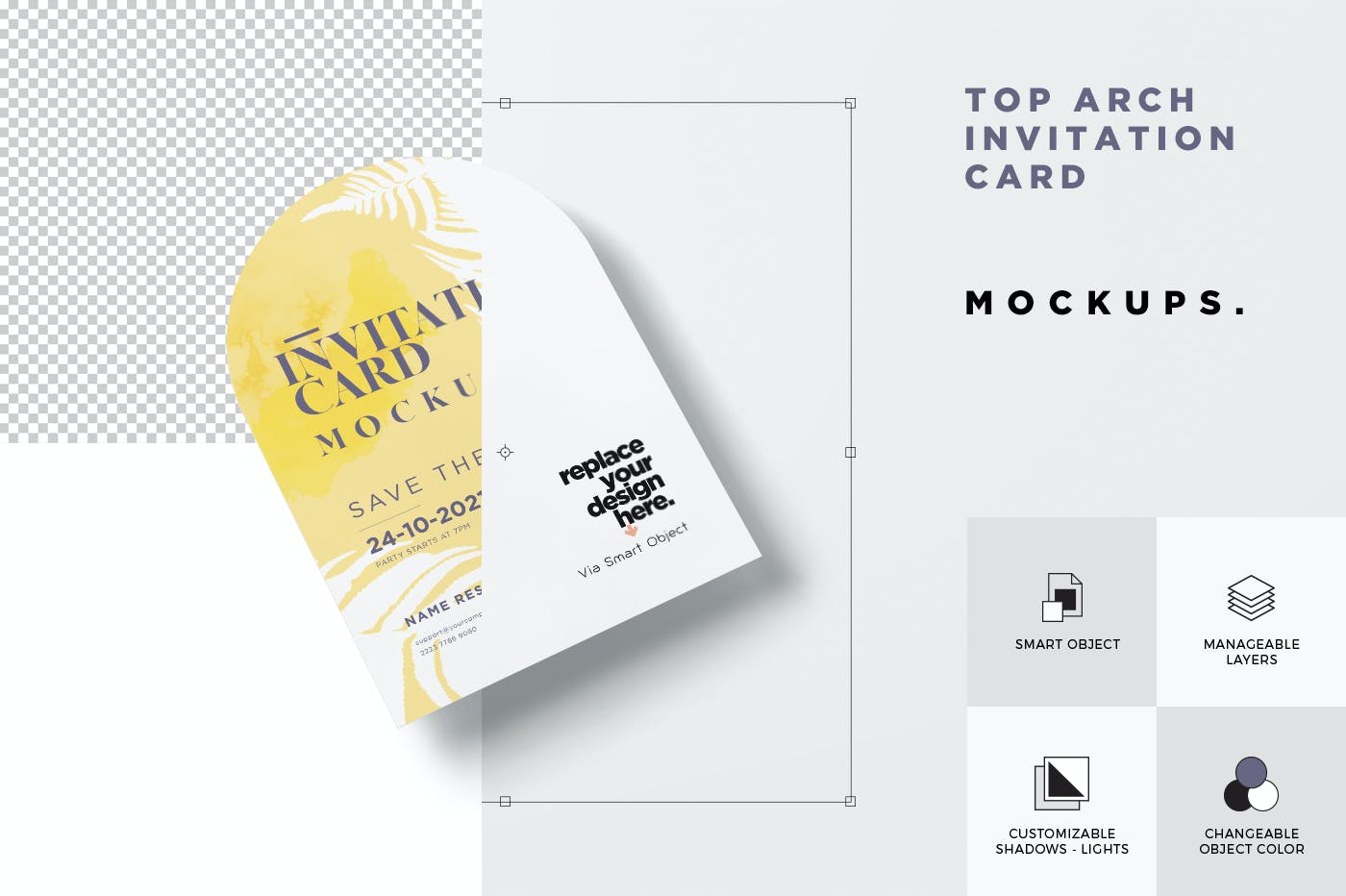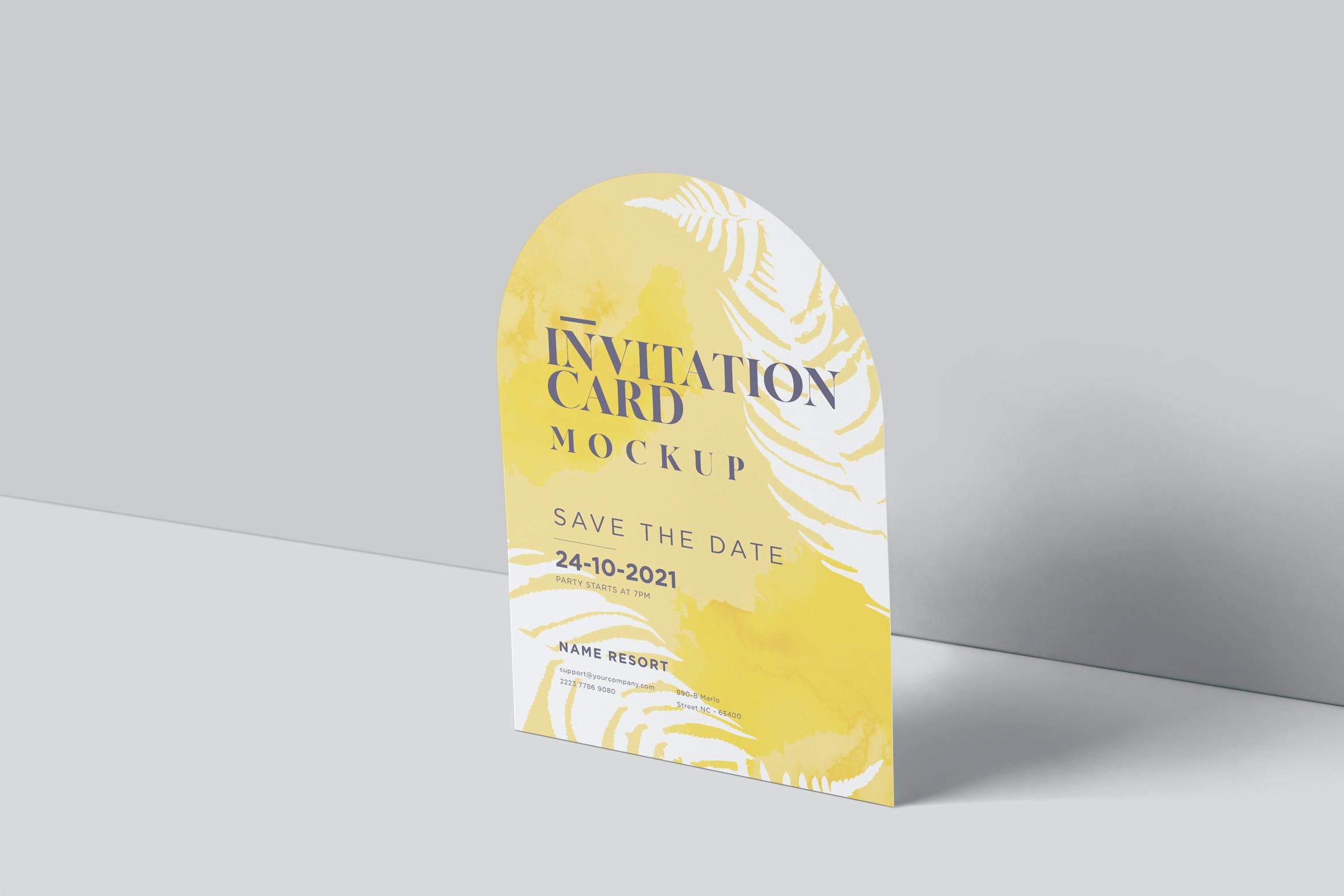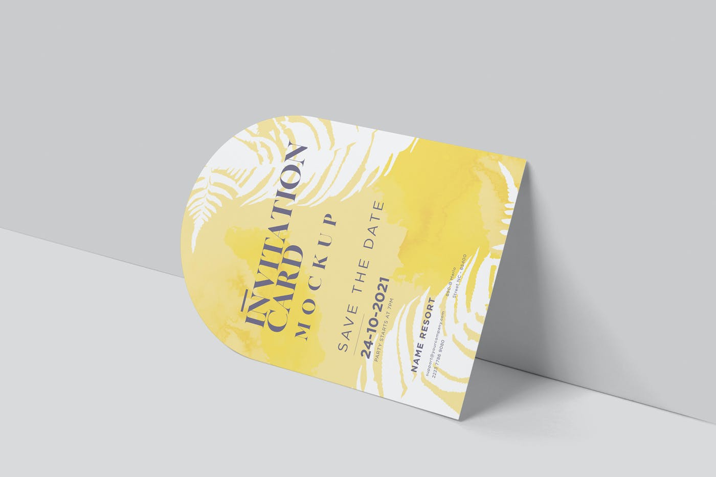弓形邀请卡设计样机模板,使您能够惊人地展示您的问候和邀请品牌设计。具有智能对象选项和管理良好的图层,让您只需单击一下即可自定义设计、颜色、阴影和背景。