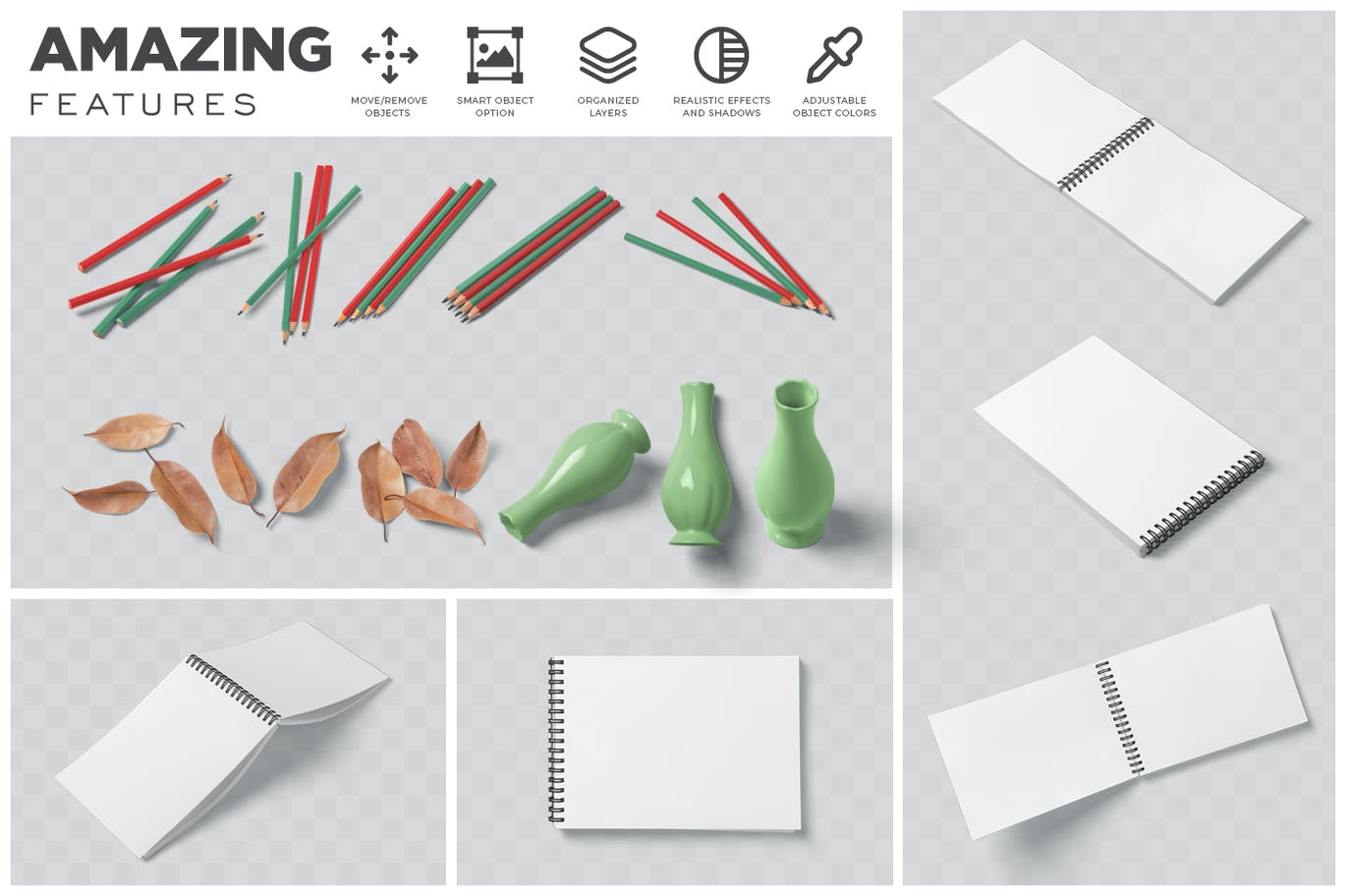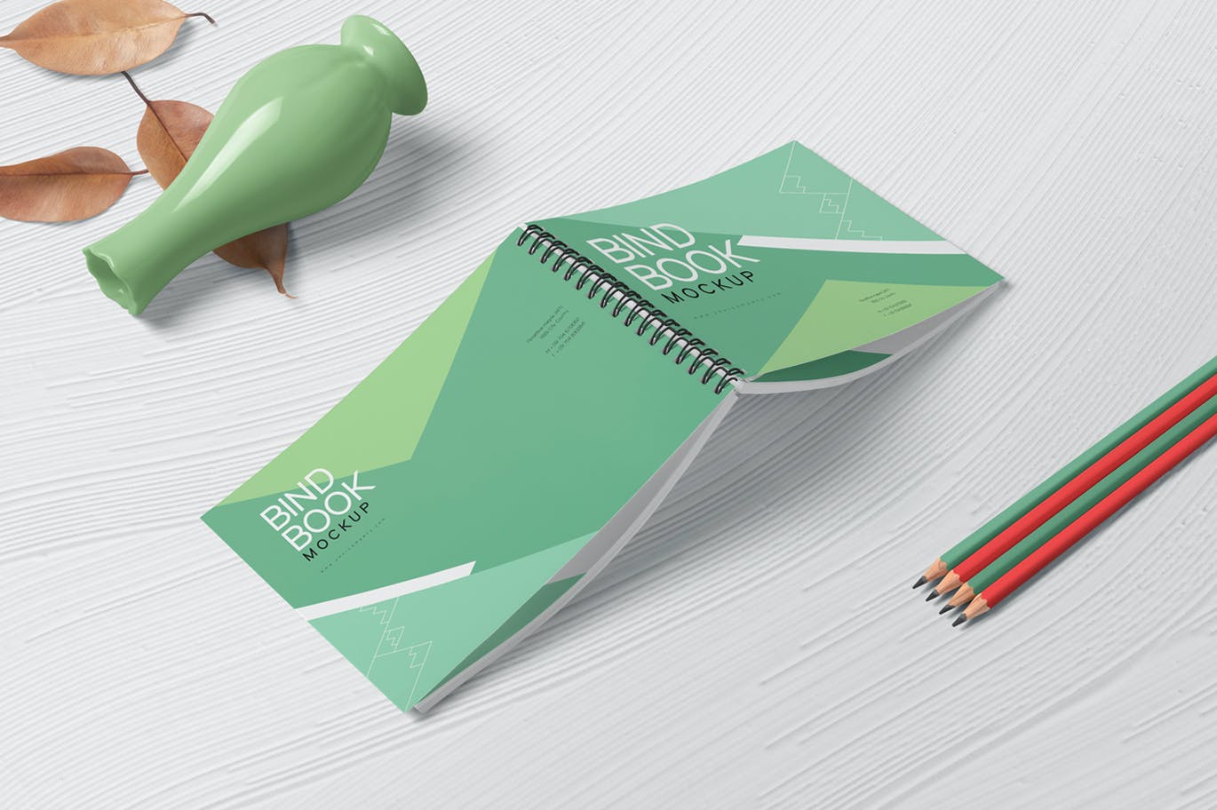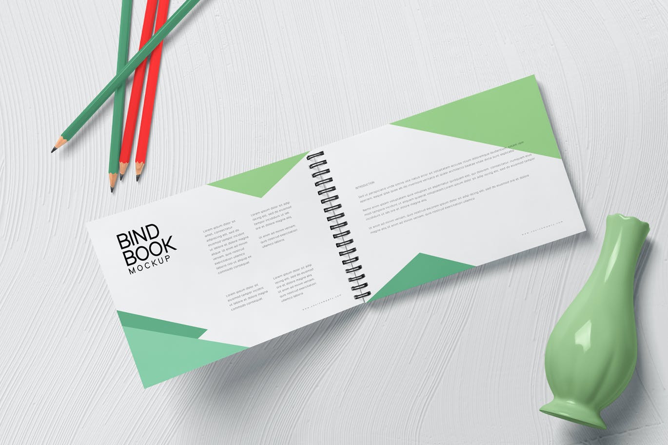 这些 A5尺寸横版螺旋活页书籍设计样机素材是真实展示您的图书品牌设计的完美选择。您还可以使用这些为您的在线商店制作螺旋书图像。为您的演示需求提供一些额外的项目和独特的视角。只需在 Photoshop 中打开这些文件,即可无限展示您的图书品牌设计。
