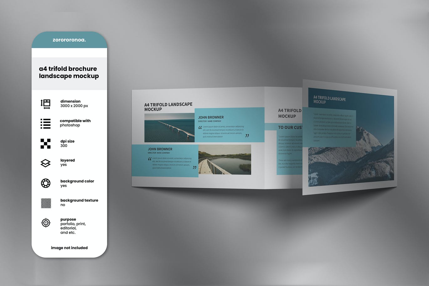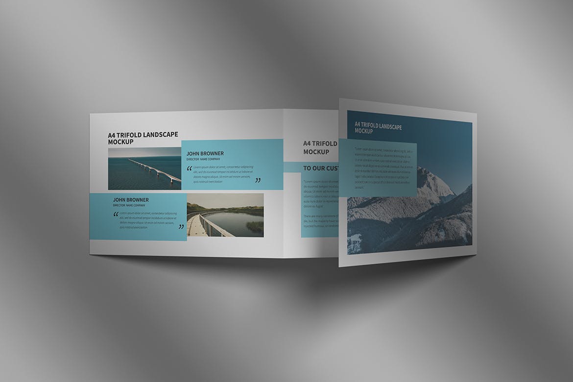 A4尺寸三折页小册子设计样机素材,适用于以逼真的外观展示您的设计。这些样机文件使用智能对象功能,可帮助您在几秒钟内更改设计。