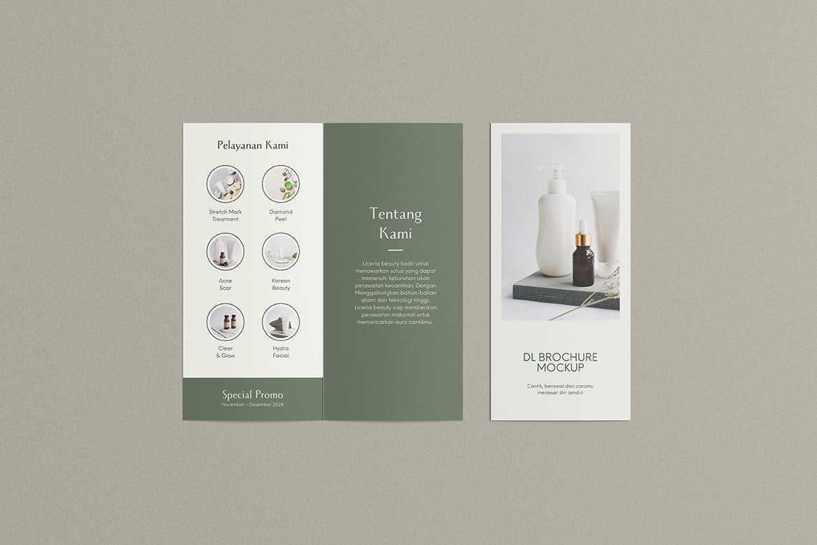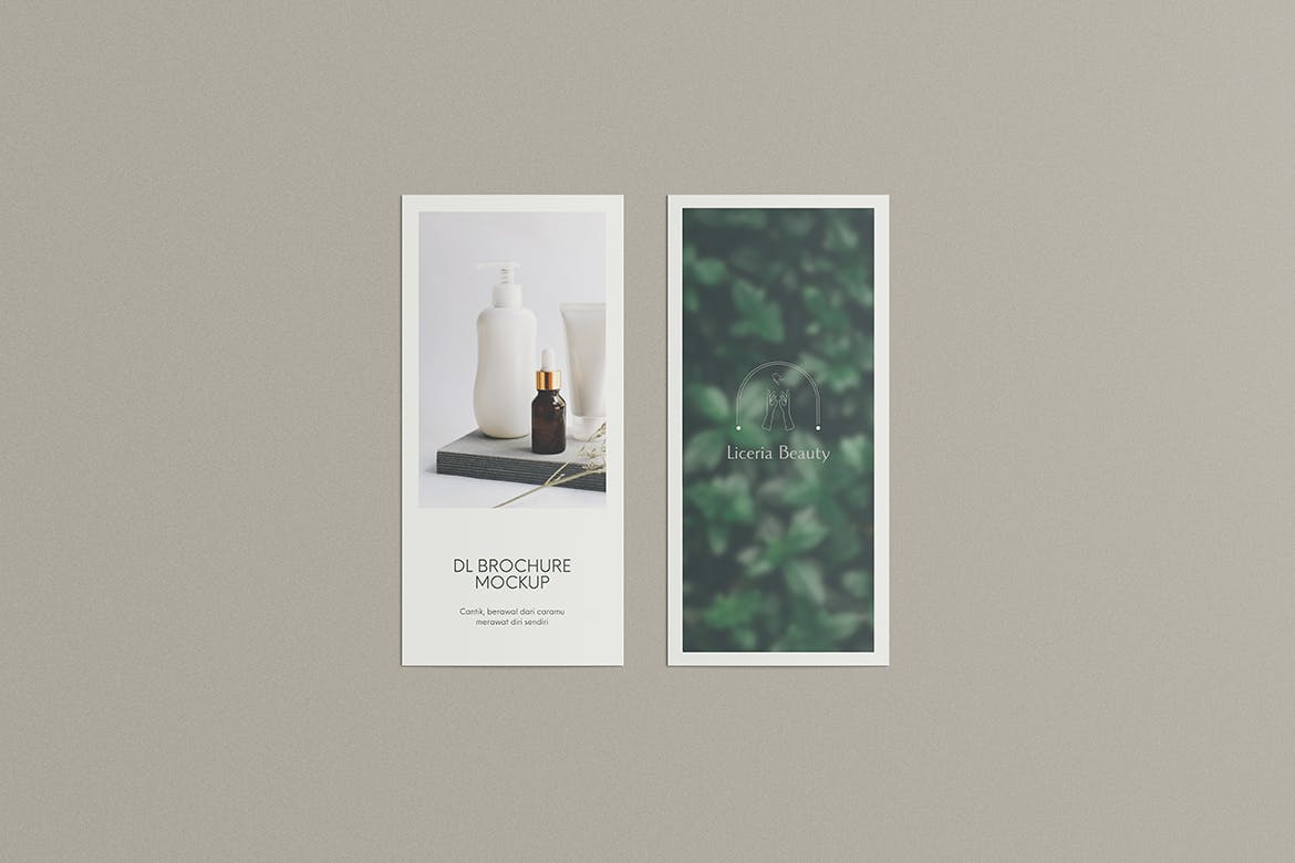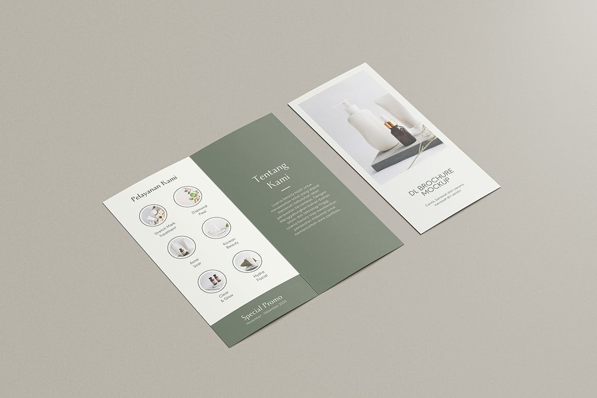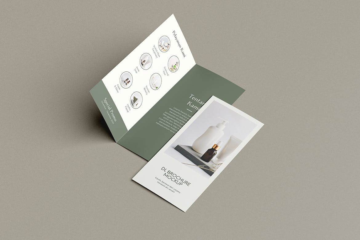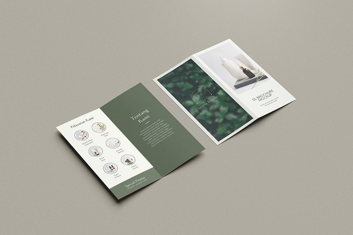 该双折页DL传单小册子样机包括 6 个带有分层 PSD 文件的项目,并且该模型还使用智能对象功能,这意味着您可以在几秒钟内轻松快速地更改当前设计。