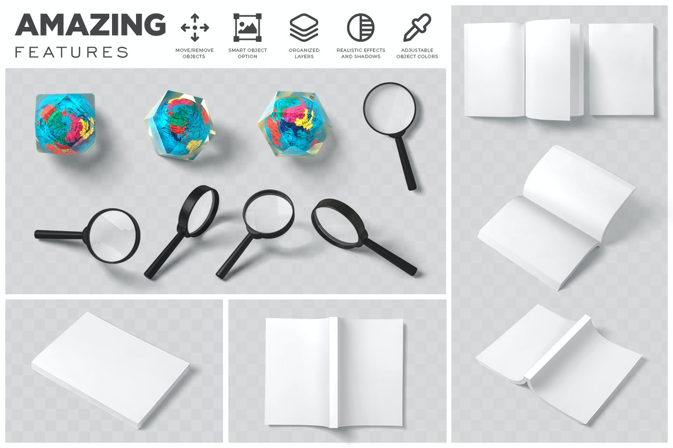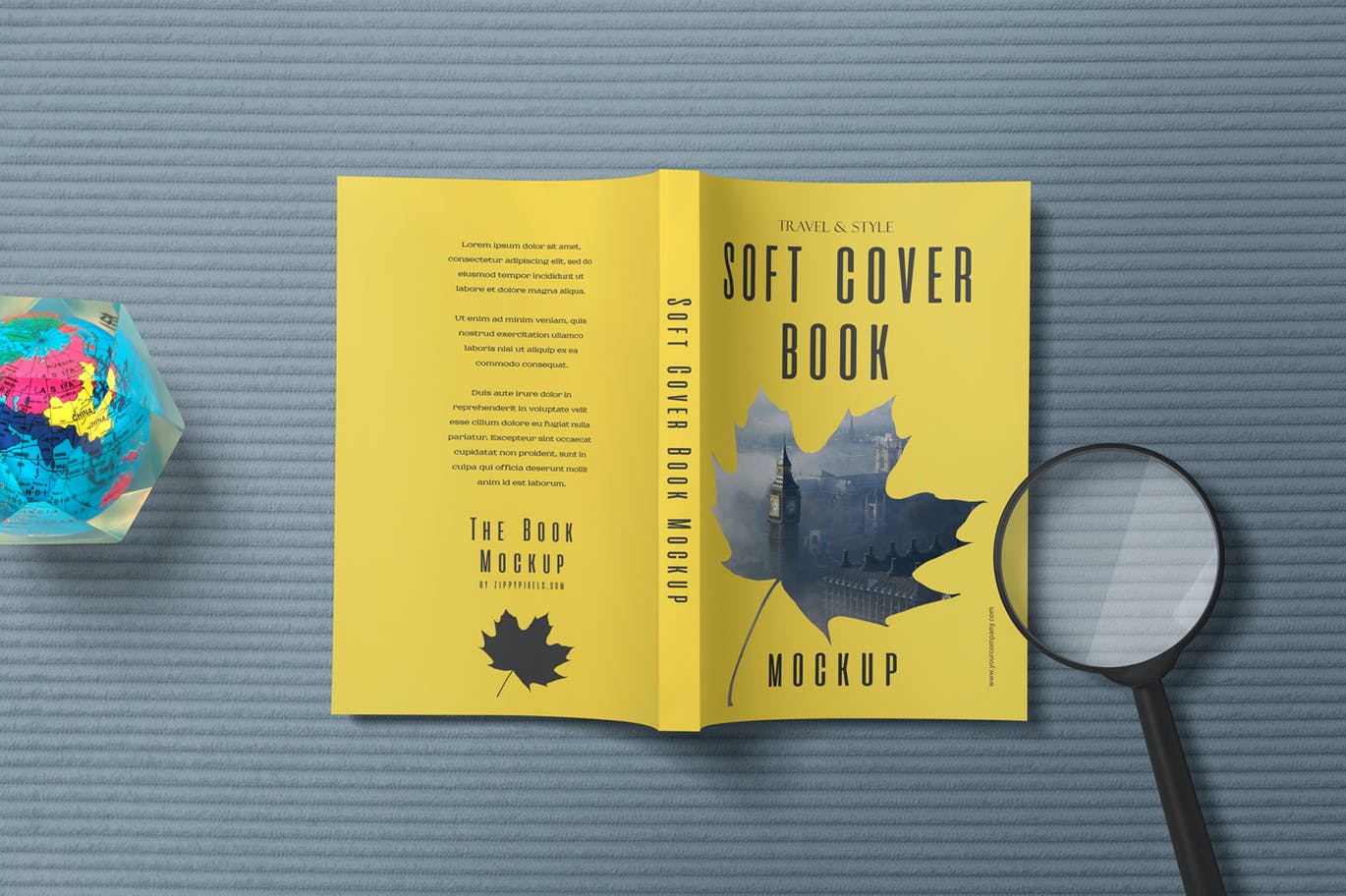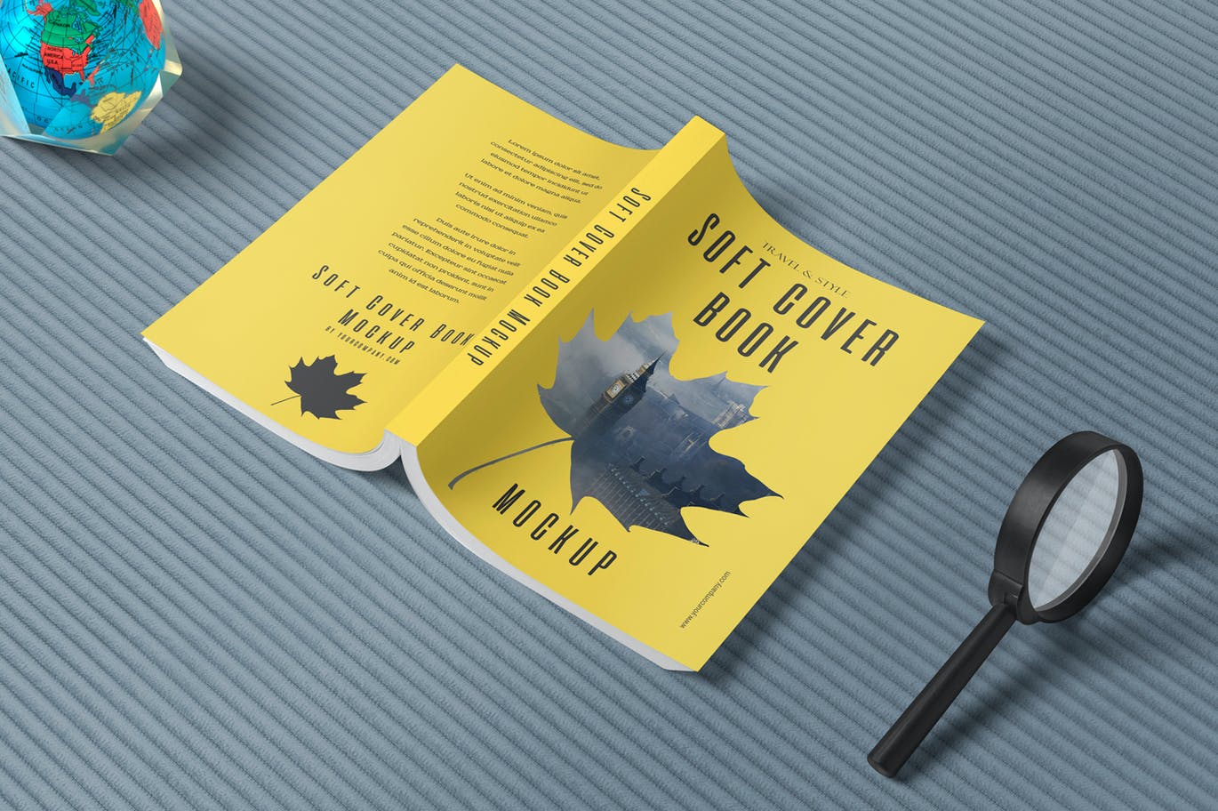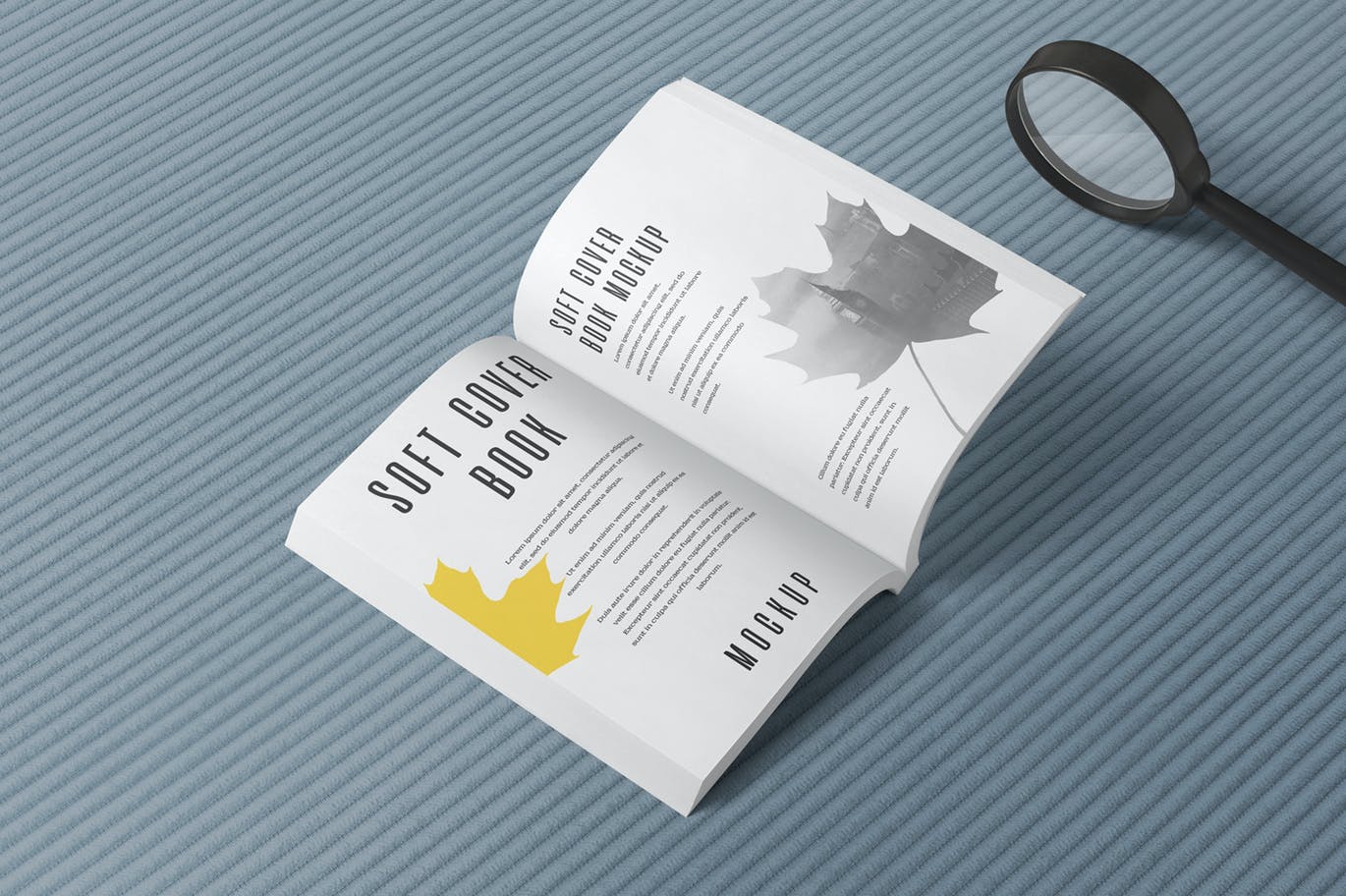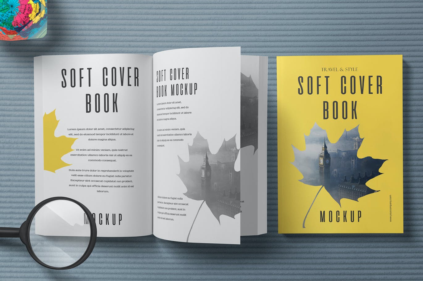 软皮书书籍效果图样机,以展示您的设计从多个角度。具有打开和关闭软封面书与不同的支持元素。您可以使用智能对象选项和层轻松自定义设计、阴影、效果和背景。这些样机场景中的所有元素都有单独的层,因此您可以轻松地单独自定义其中任何一个。