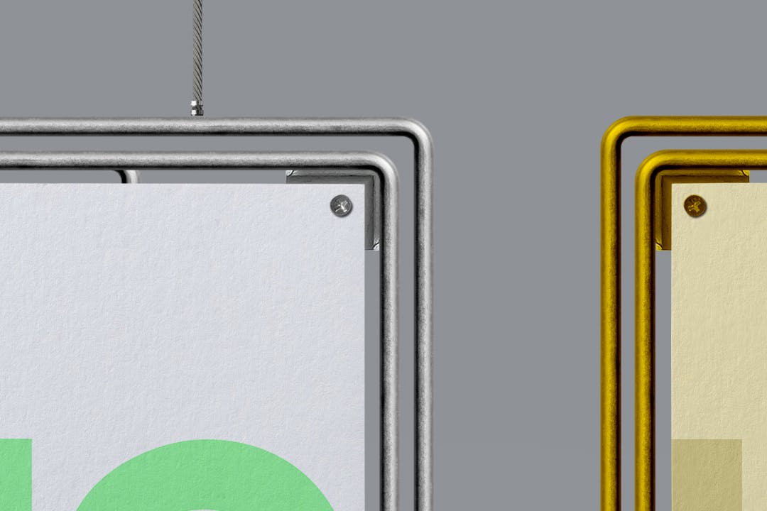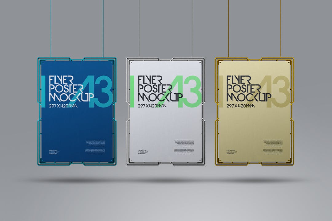 该悬挂式金属框架A3海报样机套件将帮助您改进演示文稿或任何其他项目。所有对象、灯光和阴影都是单独的。样机很容易通过Adobe Photoshop进行编辑, 智能对象。