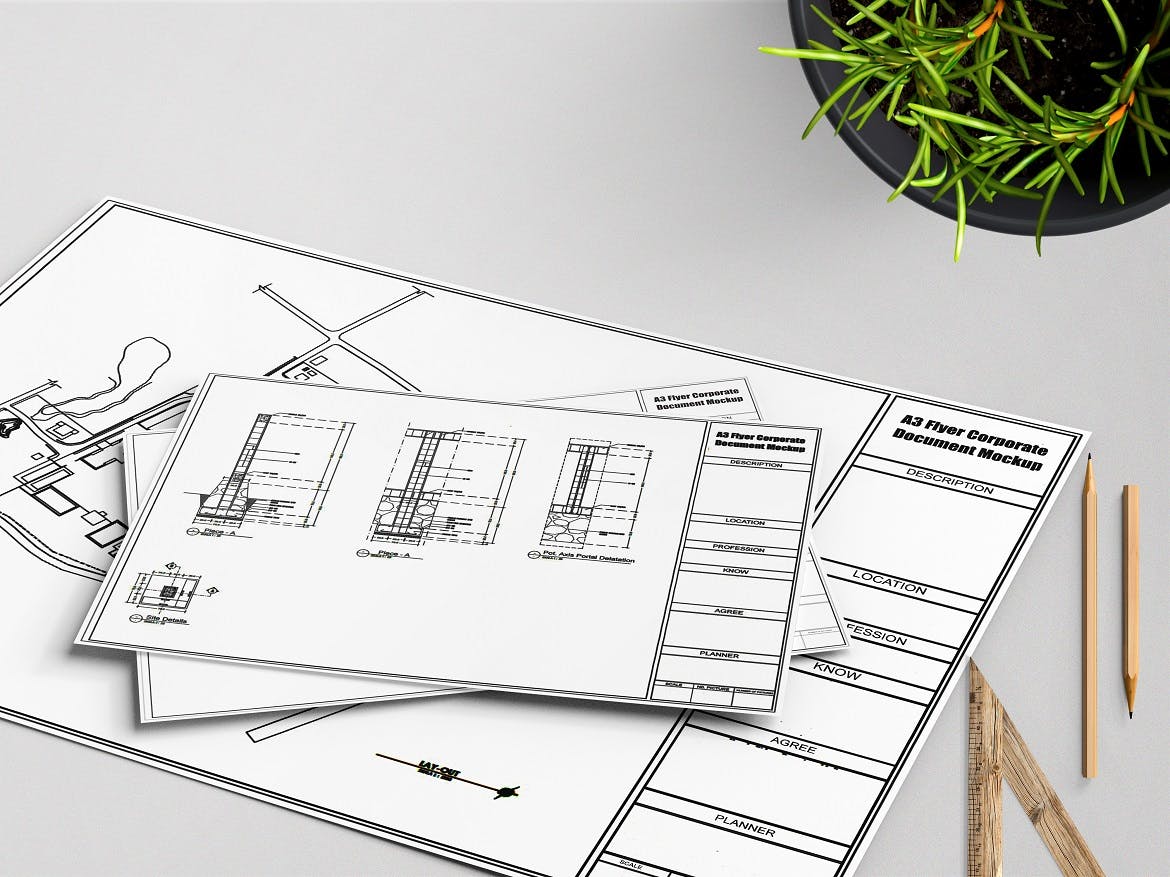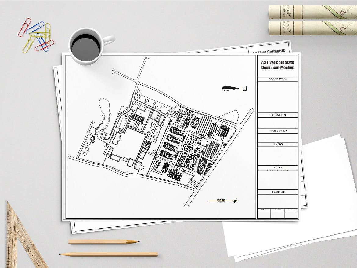A3尺寸传单公司文件文档样机。所有对象和阴影完全分离,用于打印设计、公文包、展示、广告、横幅、网站等。所有这些都是完全分层的,您可以访问阴影、反射等,并且您可以简单地自定义。