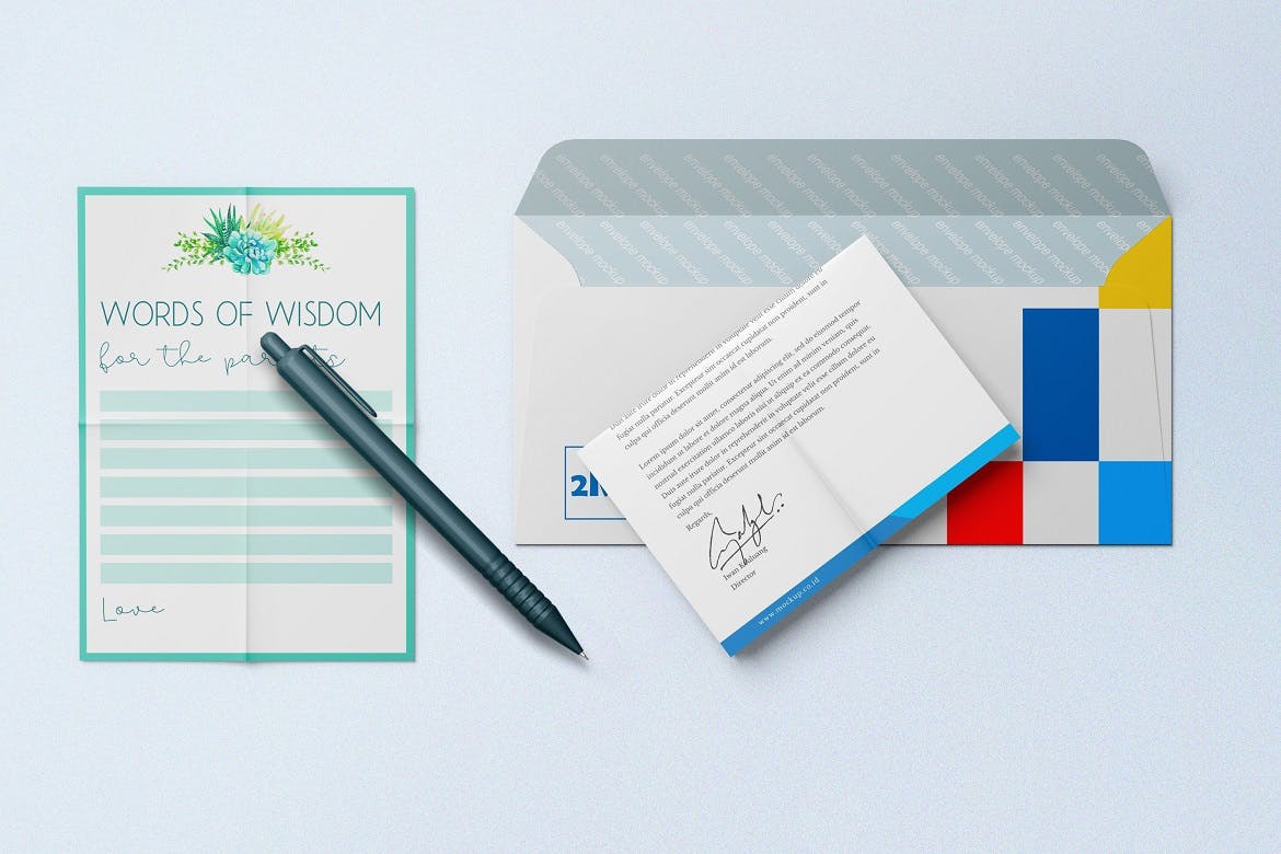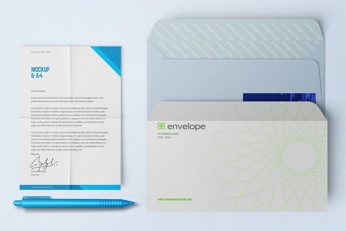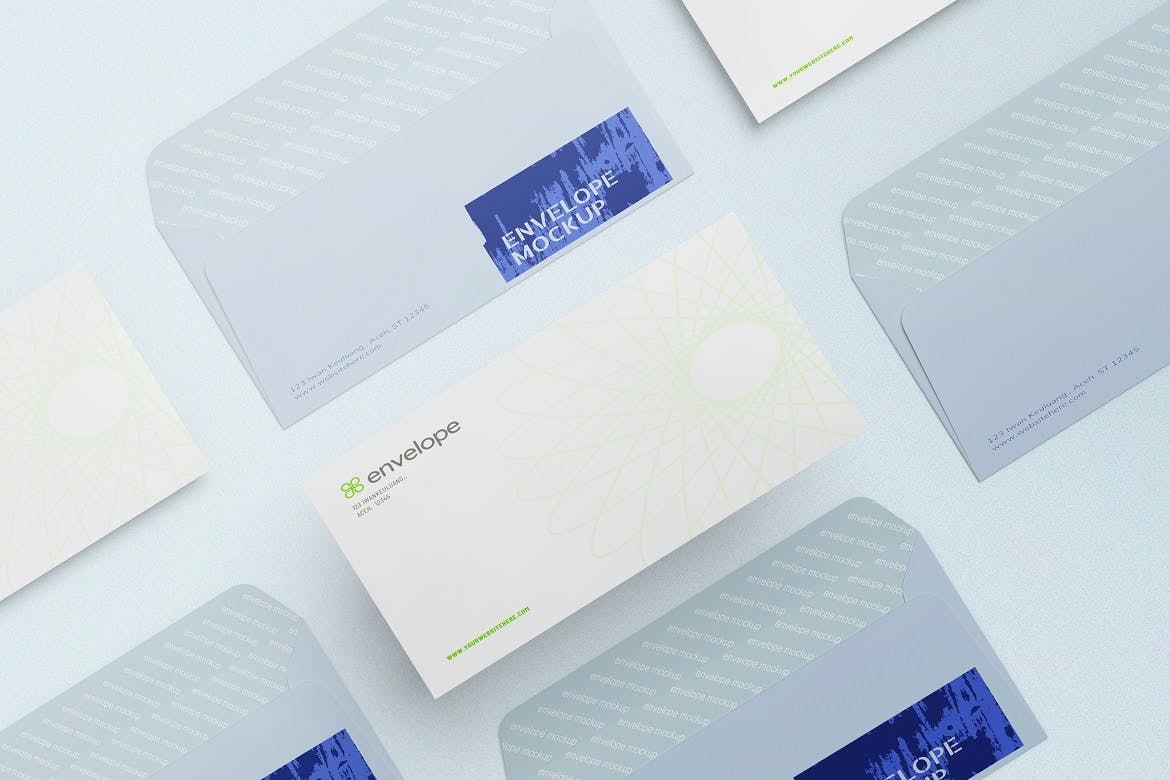 易于编辑和完全定制的信封样机在这里展示您的企业形象设计。这些样机包括不同大小的信封和名片,有智能对象和组织良好的图层。