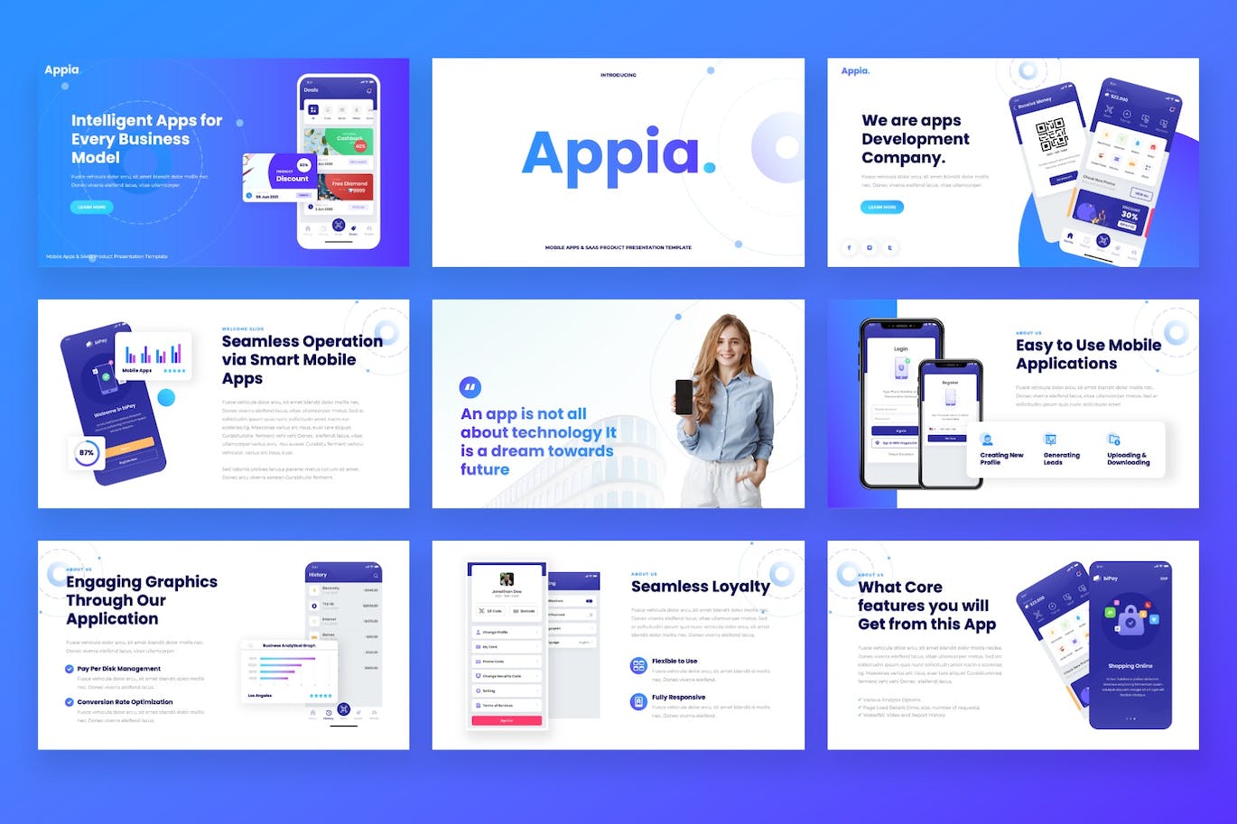 这是一个多用途的移动应用程序 Powerpoint 模板,可用于任何类型的演示:业务、投资组合、企业、移动应用程序、saas、产品,也可用于定制生产。