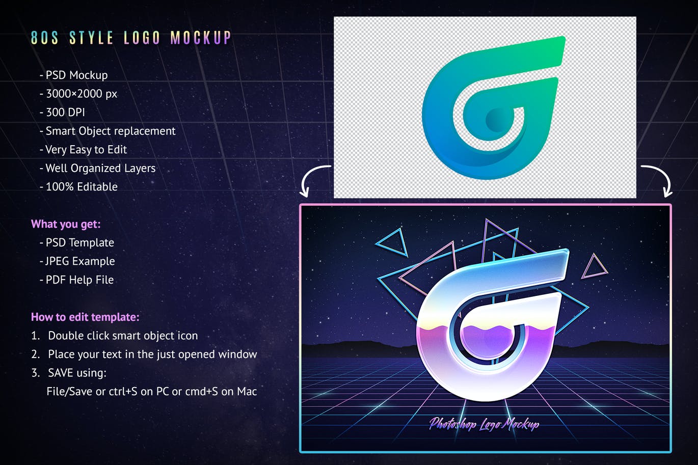 80年代风格的logo样机,用简单的方式呈现你的标志,使用3 d模型! 易于使用的Photoshop模型。只要把你的标志放在智能对象中并保存。
