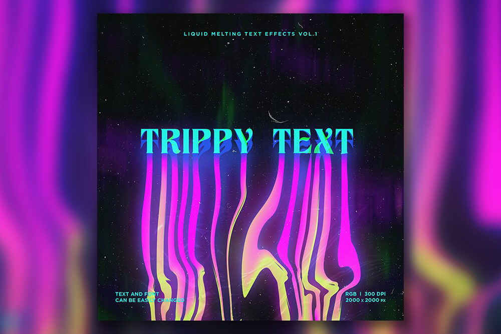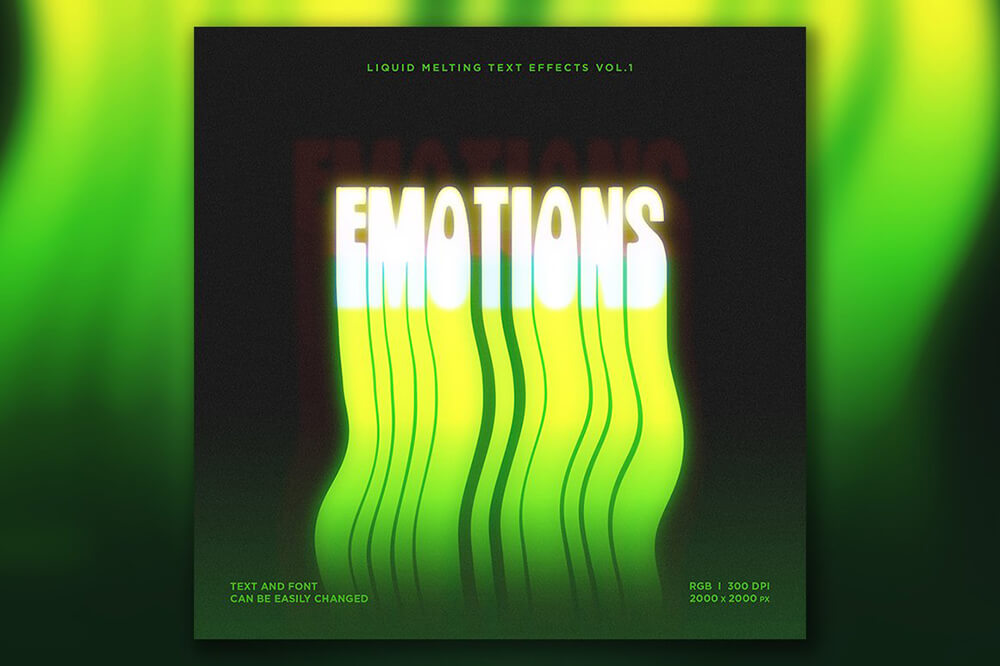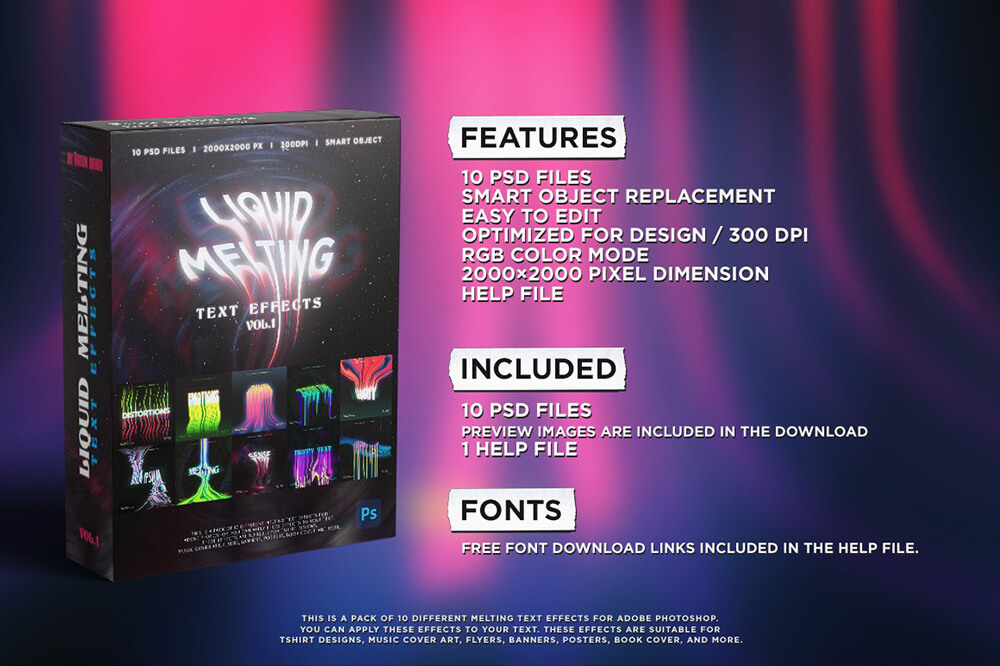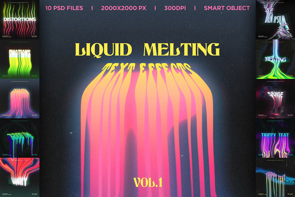这是一组用于 Adobe Photoshop 的 10 种不同的熔化文本效果。您可以将这些效果应用于您的文本。这些效果适用于 T 恤设计、音乐封面艺术、传单、横幅、海报、书籍封面等。