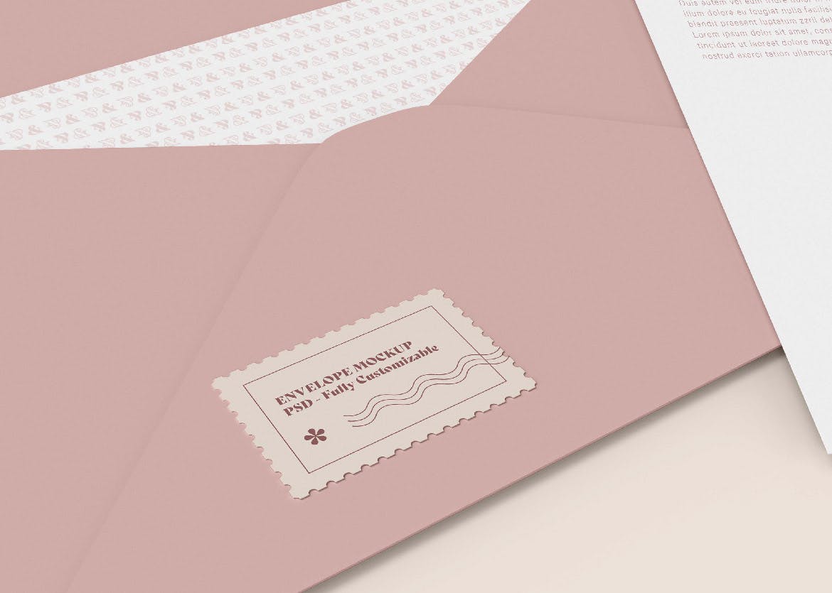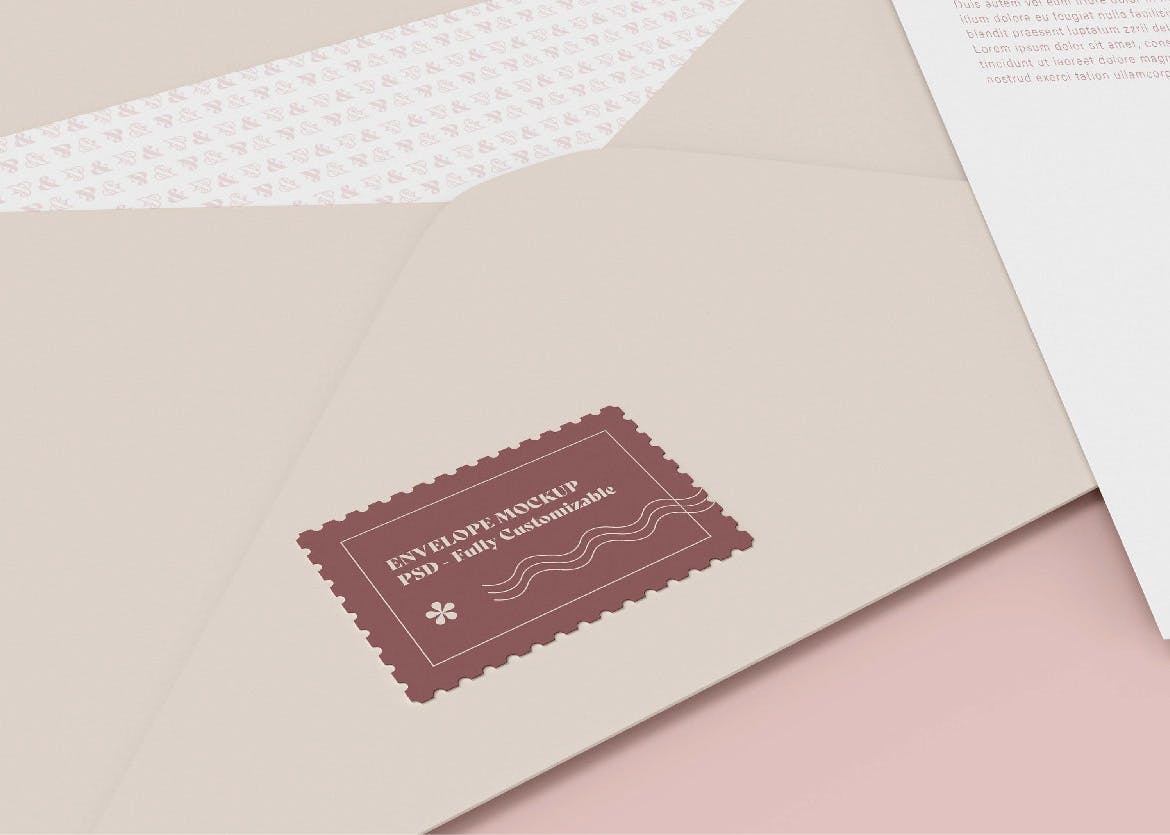 信封设计特写样机模板素材,样机上有一个智能对象可以帮助您调整设计,拖放即可。它的使用非常简单,使用纯色图层,易于重新着色。高分辨率(300 dpi),下载文件中不包含示例设计。