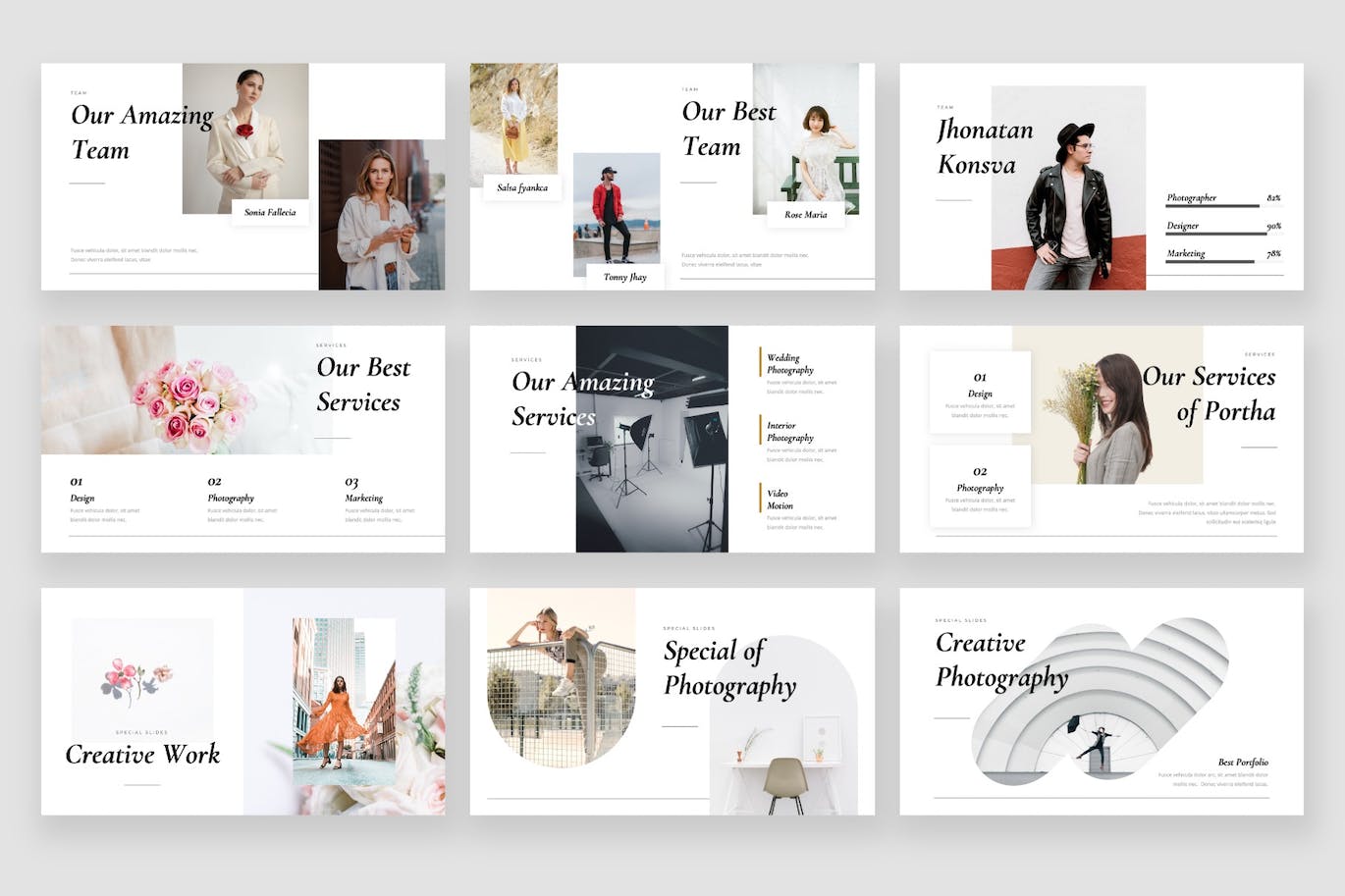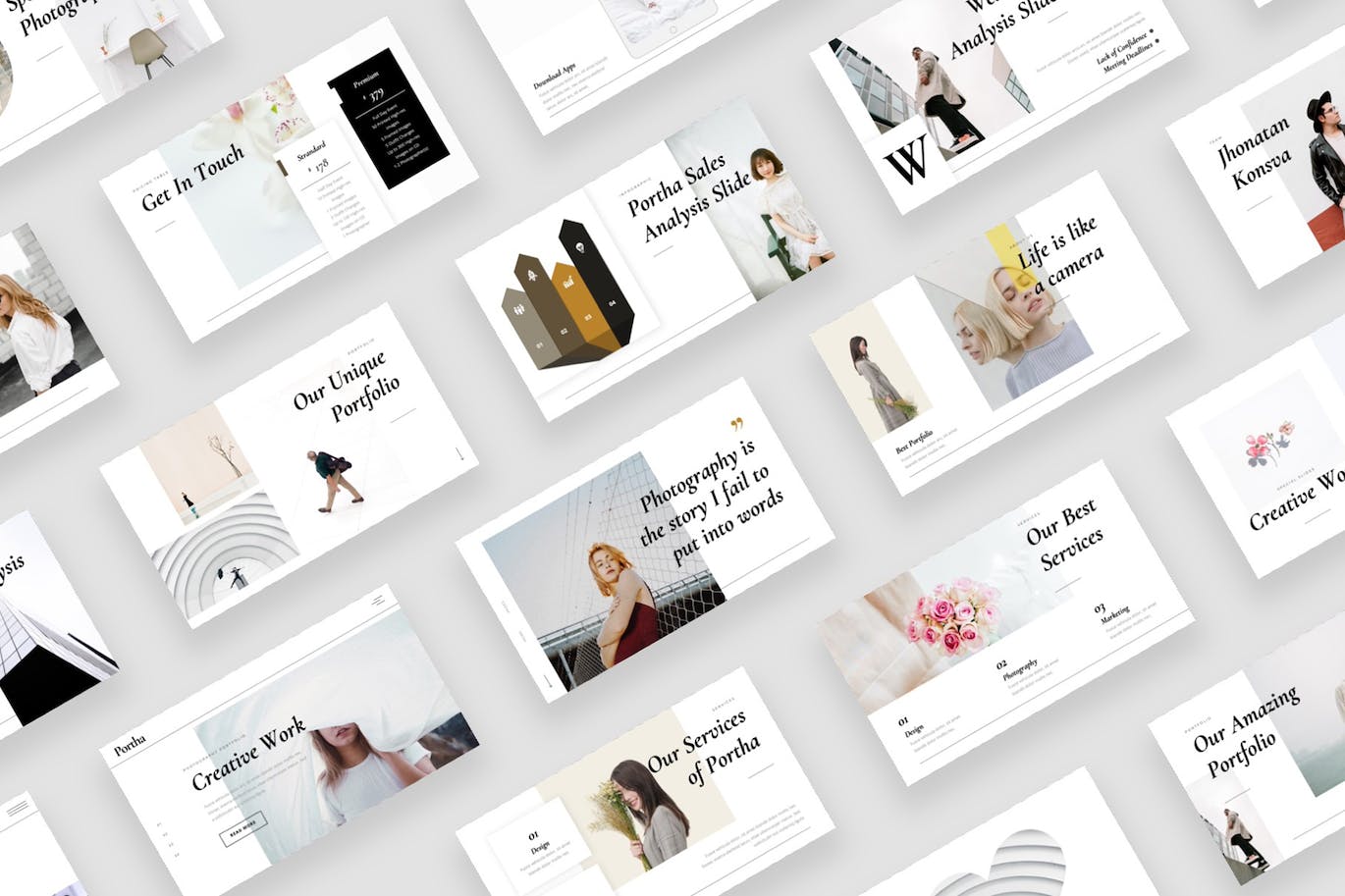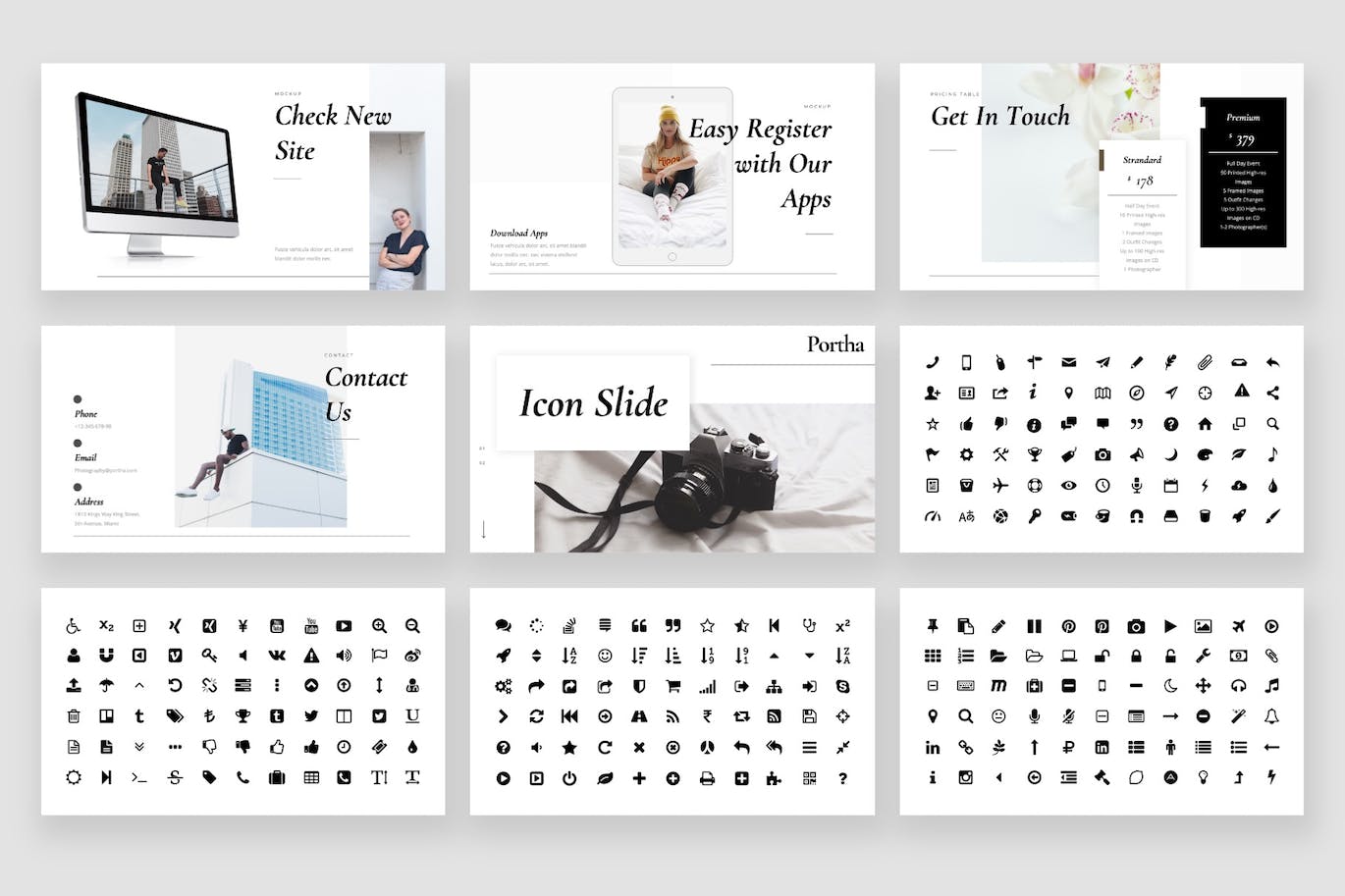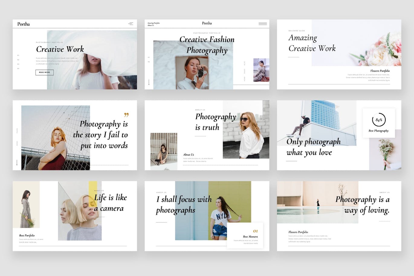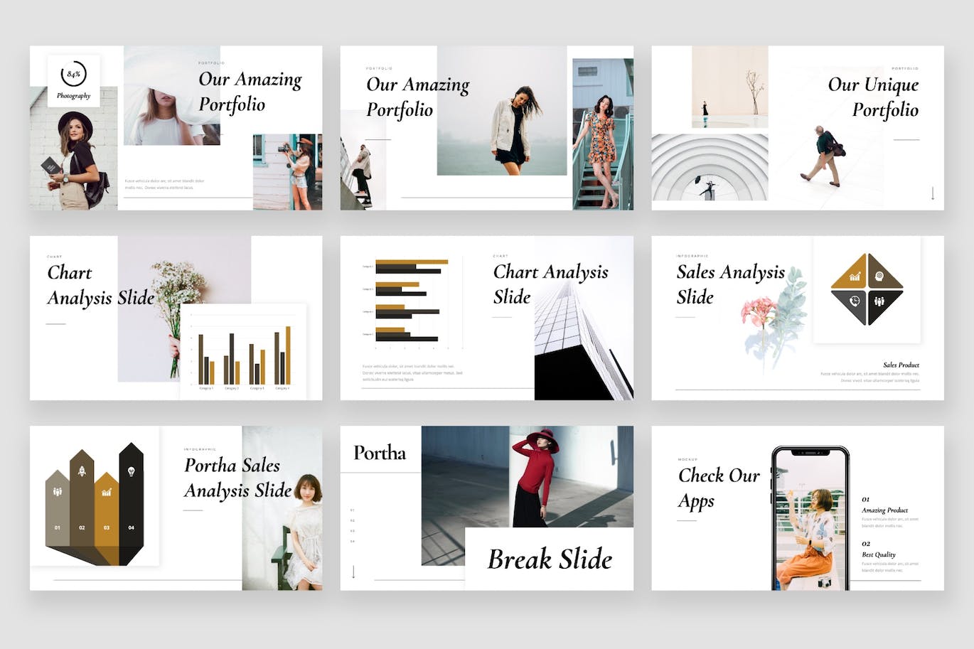Portha–摄影作品集Powerpoint模板具有专业、超现代和独特的设计,每张幻灯片都是以热爱和关注细节的方式创建的。